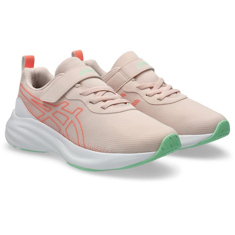 ●シンプルさと動きやすさを兼ね備えた、通気性と耐久性に配慮したゴムひも+ベルトのシューズ ●アシックススポーツ工学研究所のデータをもとに作製したキッズ専用ラストを採用、シンプルさと履き心地にこだわったクッションモデル。 アウターソールはラバーの面積を大きくすることで耐久性に配慮。 ミッドソールにはクッション性の高いE.V.A.を採用。ラバーには貫通孔を配置し、屈曲性に配慮しています。 アッパーは通気性のよいラッセルメッシュ。 脱ぎ履きしやすい靴ひも風のゴムひもタイプで、一本ベルトでフィット感の調節も可能。 成長段階の子どものかかとを固定し支える樹脂製ヒールカウンターを搭載。 かかと部には反射プリントを配置。 パーツ数を少なくしたシンプルなデザインで、お出かけや通学などの普段使いにも適した一足です。