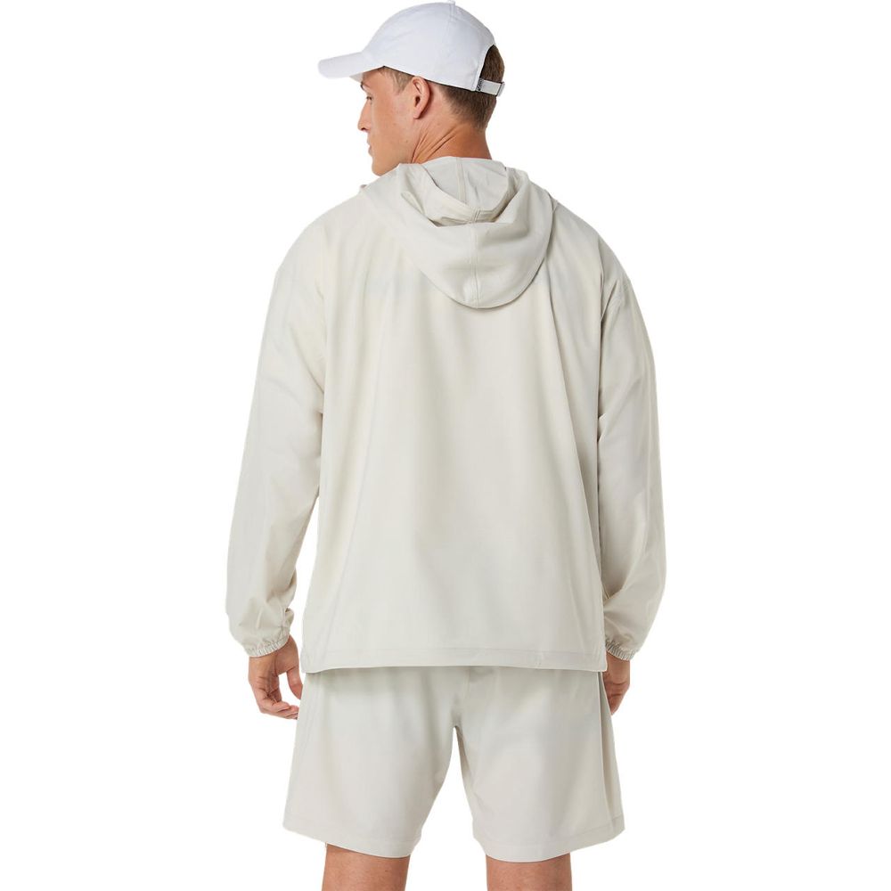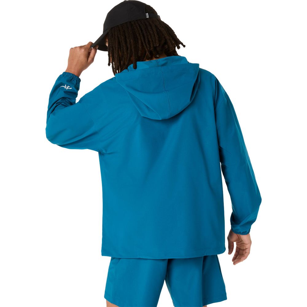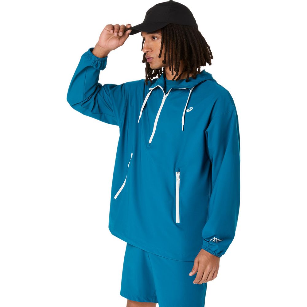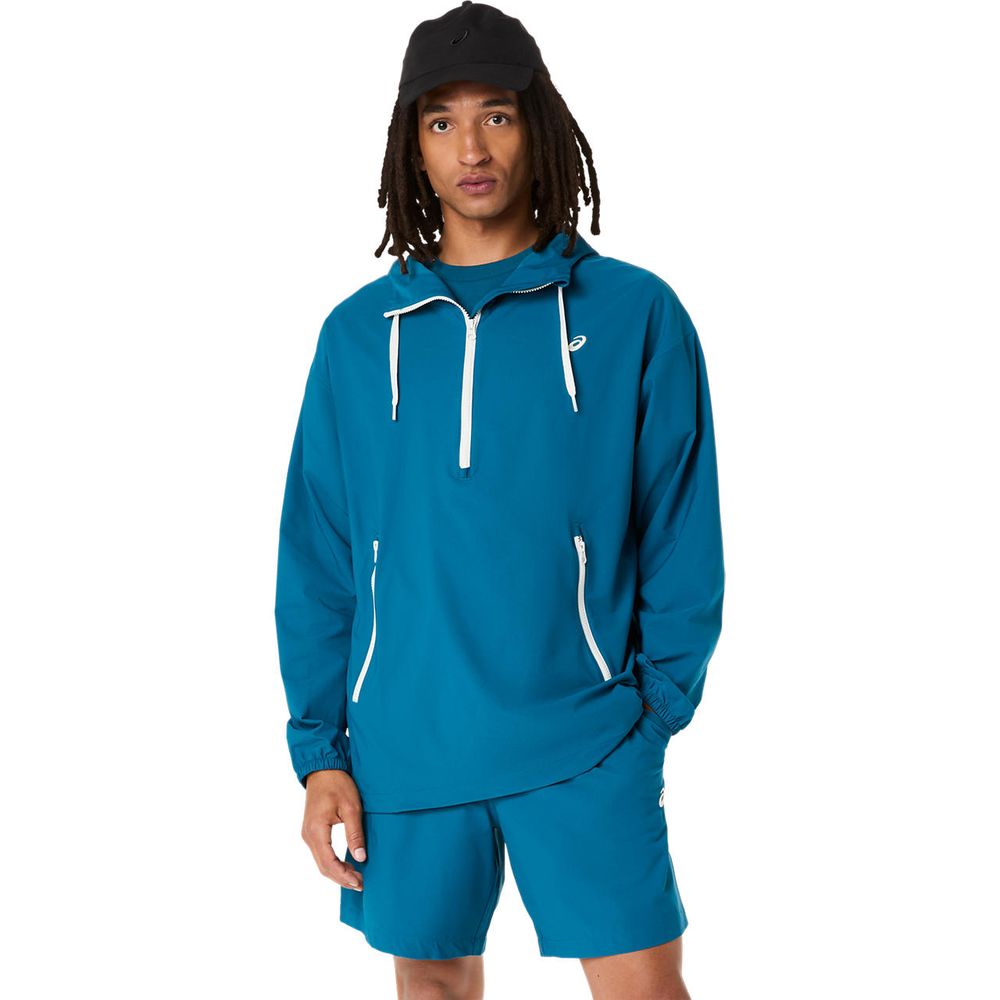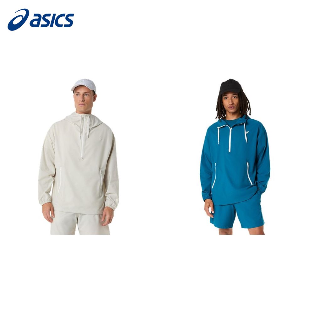 ・ソロテックスを採用しストレッチ性を追求・裾にはドローコードを採用し調整可能に・フロント部にはハーフファスナー、ポケットにもファスナーを採用・左胸にASICS Spiralロゴ刺?/左袖先にアシックスストライプの刺?を採用