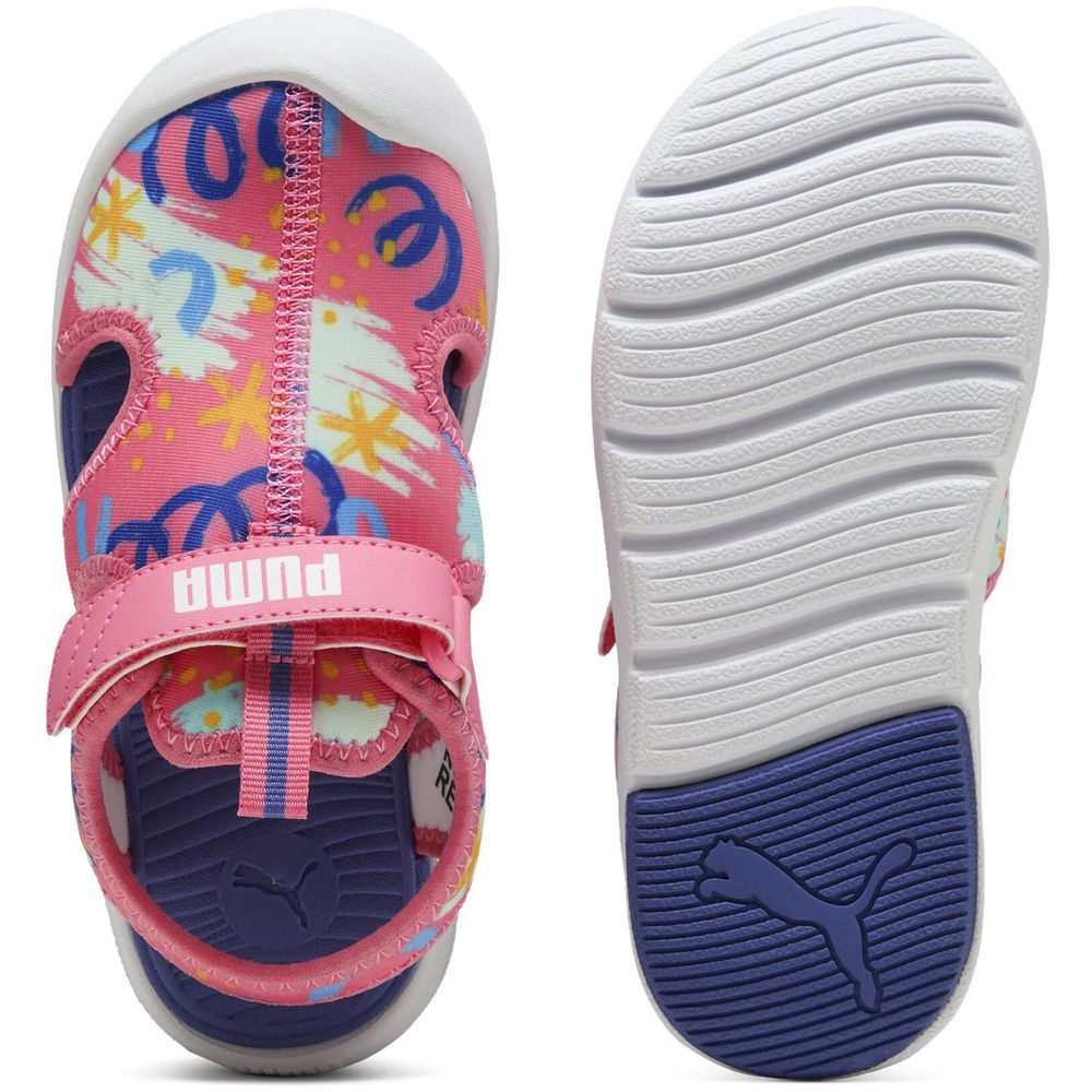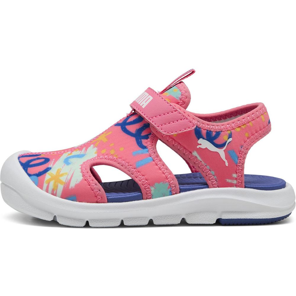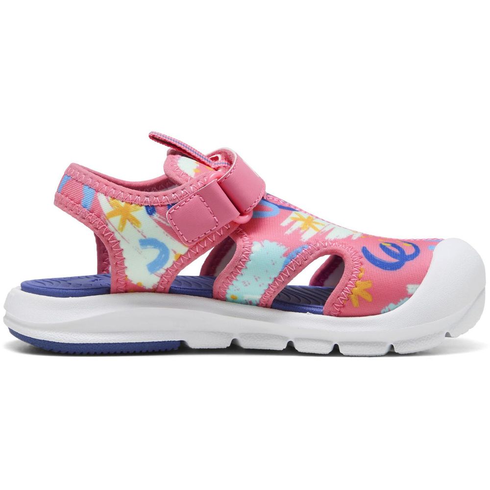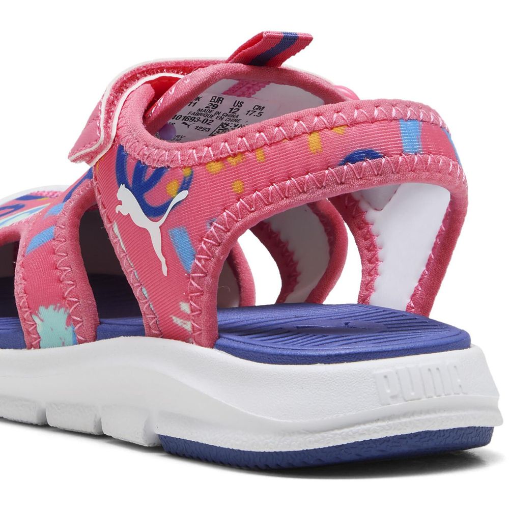 夏にぴったりな軽量で通気性に優れたプーマファンレーサーAOPサンダル。夏を感じさせる色鮮やかな総柄のグラフィックで気分を盛り上げてくれる一足です。お子様にも履きやすい面ファスナー開閉式で、小さなお子様でもサイズ調整が簡単にできます。速乾性に優れた素材、柔らかいフットベッドと柔軟なアウトソールで、夏のお出かけに最適なアイテムです。4歳から8歳のお子様におすすめのサイズ。