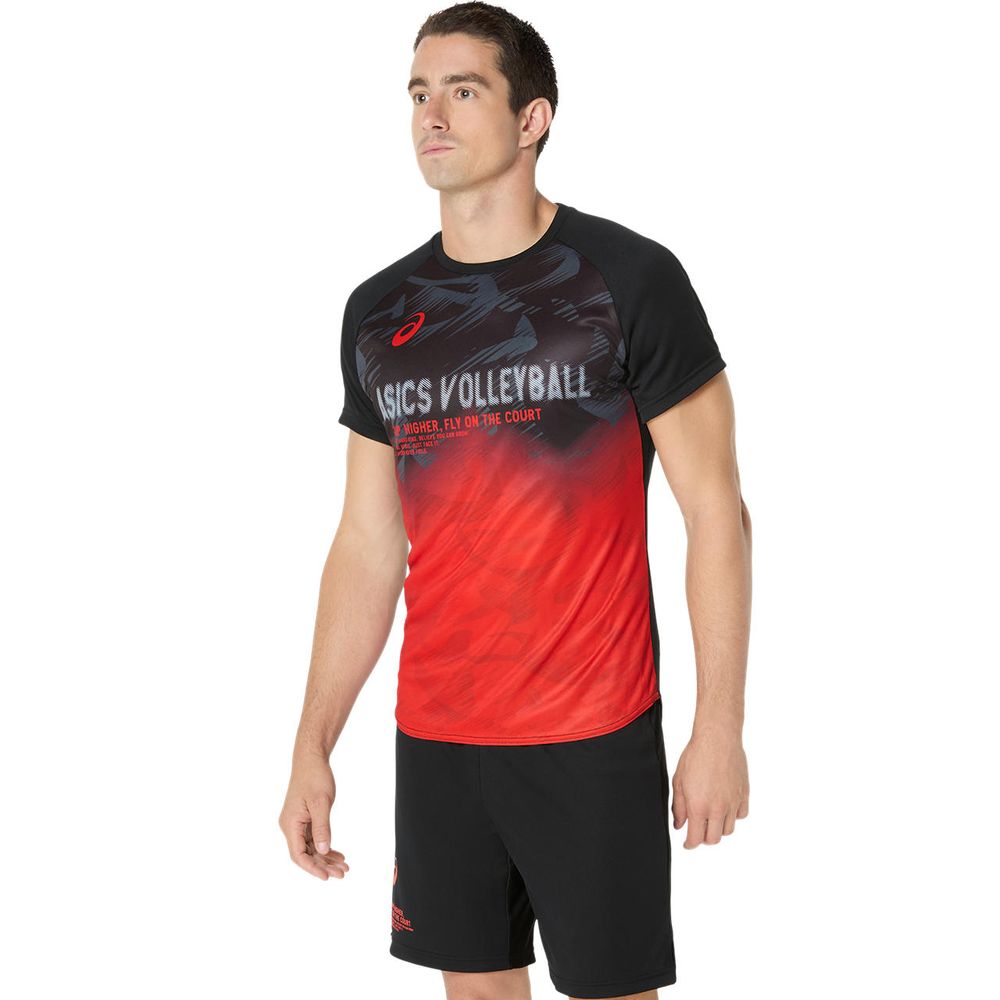 ●ACTIMOTION(アスリートの動きやすさを追求したアシックス独自のテクノロジー)を採用した半袖シャツ。シーズングラフィックを前面にプリント。