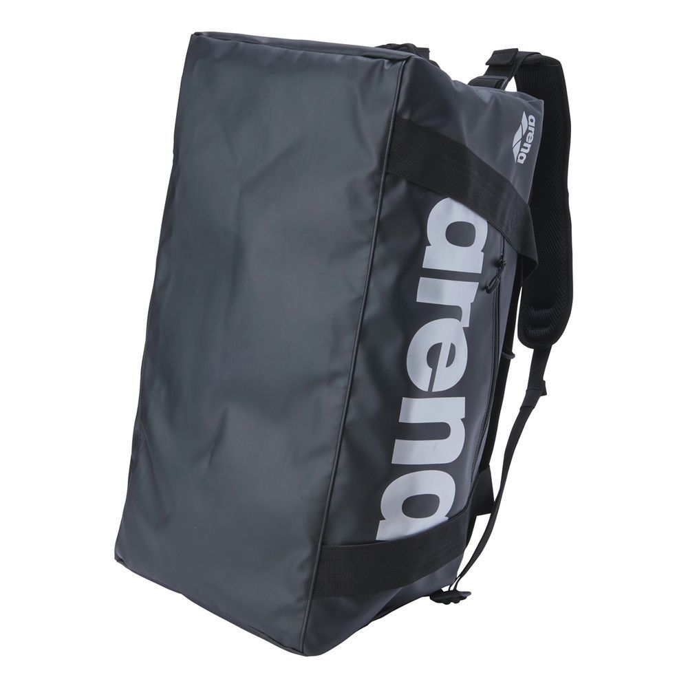 プールサイドでも使用しやすいはっ水素材を使用した2ウェイボストンバッグ。荷物の重さや使用用途によって使い分けできる手持ちのボストンバッグタイプと持ち運びしやすいバックパックタイプの2ウェイ仕様。またファスナーが大きく開くことで物の出し入れがしやすく、約50Lの荷物を収納できる大容量。パスケースや小物等の収納に便利な前ポケット付き。合宿に行く学生スイマーや遠征に行くマスターズスイマーにおススメ。