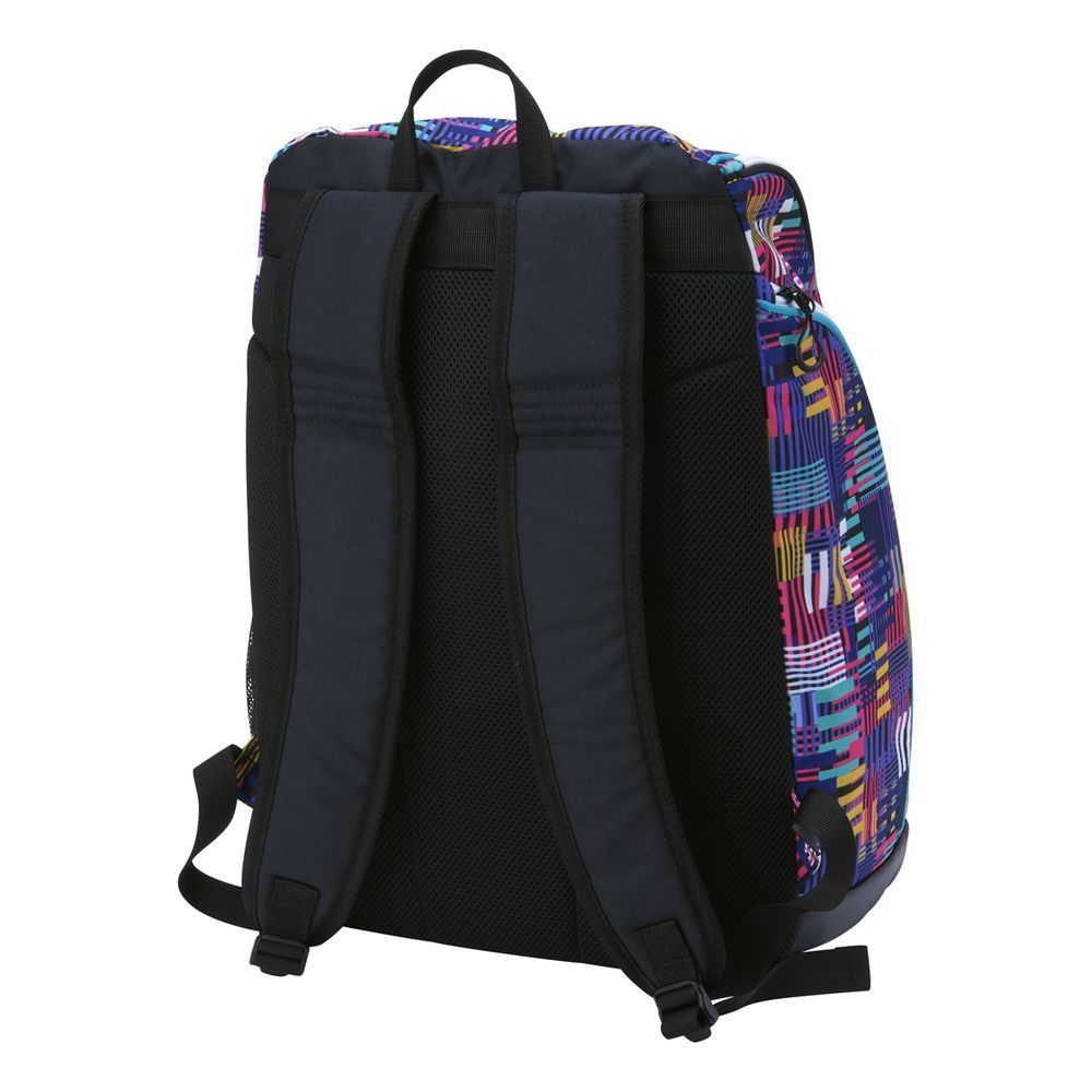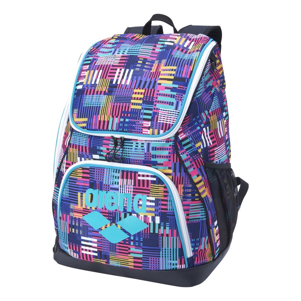 arenaの定番バックパック(AS5SBP11U)に、25FWのデザインテーマを落とし込んだ総柄モデルのバックパック。エントリースイマーから学生スイマーまで幅広いユーザーにおススメ。上部の大きい間口が物の出し入れがしやすく、約35Lの荷物を収納できるので、練習でも試合でも使用用途に合わせて活用可能。サイドに大きめの縦ポケットとメッシュポケット付き。正面ポケットは小物の収納としての使用はもちろん、ビート板を固定できるショルダーテープを採用。またサイド上部にDカンがついているので、ゴーグルケースやキーホルダーなどが装着可能。上蓋部にはチーム名などのマーキングができるので、チームで揃えることも可能。