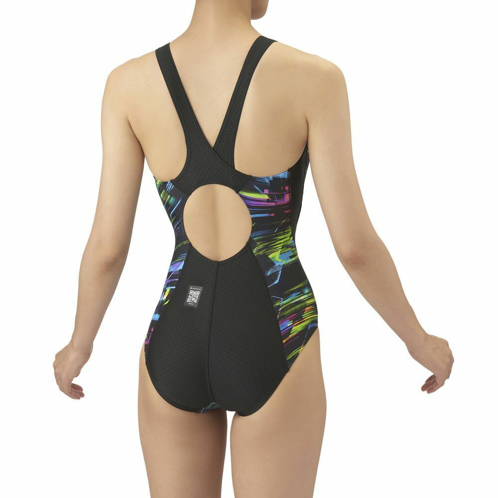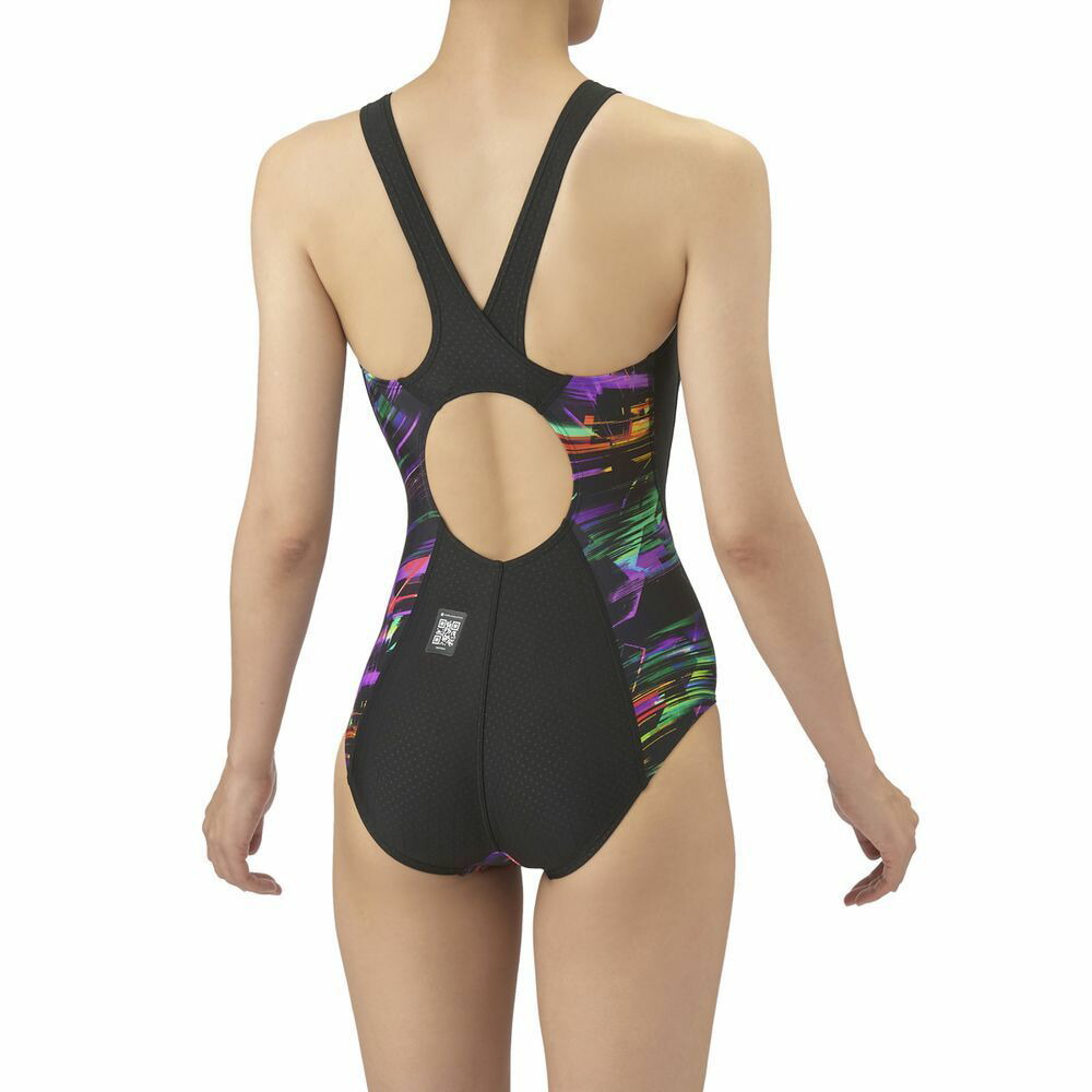 環境に配慮したリサイクルポリエステルを使用したニット素材ECO AQUASTRIPE-Dを採用。初級レーシングスイマーへ向けた「AQUA RACING」シリーズ。公式大会に出場するために必要なWORLD AQUATICS(世界水泳連盟)承認モデルの競泳水着。伸びのあるフィット感と安心感のある地厚な生地。はっ水加工でシャープな水切れが特徴。着脱が楽で肩紐がずれにくい着やストラップを搭載。初めてレースに出場するスイマーにオススメ。レーシングらしいスポーティなグラフィックの総柄デザイン。*この商品は縫製上、一点一点プリント柄の見え方に違いが生じますので予めご了承ください。