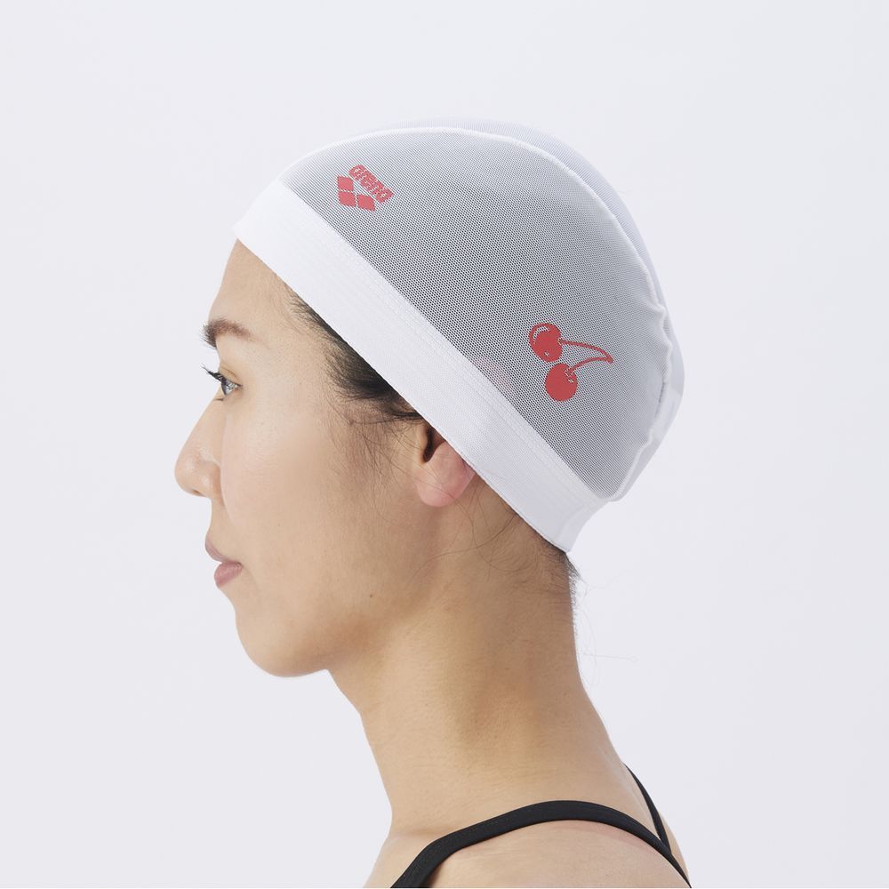 さくらんぼ、フィンをモチーフとしたメッシュ素材のスイムキャップ。様々な水着とスタイリングしやすく、遊び心のある可愛いらしいデザイン。水抜けが良く、ハードなトレーニングでもムレ感少なく快適に泳ぐことが可能。ハードなトレーニングするスイマーにも、ゆったり泳ぎたいスイマーにも、練習時の着用におススメ。公式大会招集所持ち込み可。