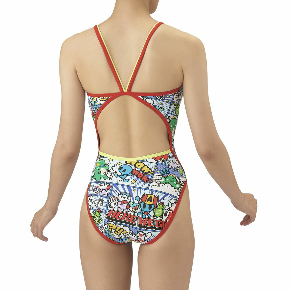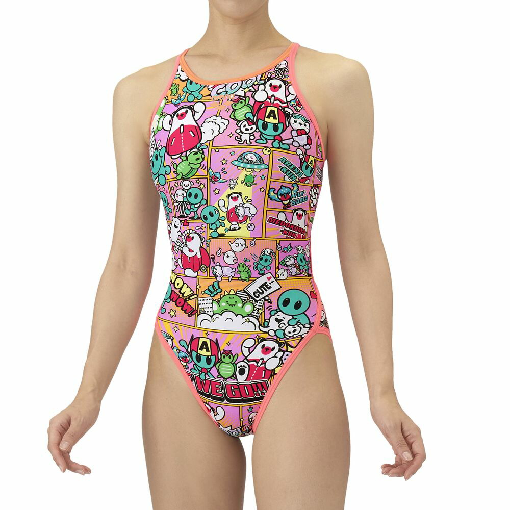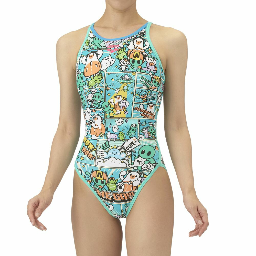 トレーニングカテゴリー「TOUGHSUITシリーズ」。ジュニア用サイズ大会に向けて練習を重ねる頻度が高いスイマーにオススメの練習用水着。環境に配慮したリサイクルポリエステル素材「タフスキンEP」を使用し塩素に強く長持ち。全てのスイマーに人気のアリーナくんの総柄ワンピースタイプ。AS5FWM00Lで展開するテーマ(宇宙や地球)と連動する冒険物語。アメリカンコミック調の柄は鮮やかな色合いとダイナミックな線が特徴でインパクトのあるデザイン。アリーナくんたちと地球外生命体(怪獣、宇宙人、お化け)が出会い、友達になる過程をプリントに表現。地球を守る戦隊ヒーロー風のスタイルを取り入れることで、アリーナくんたちのチームとしての一体感を演出。カラフルな4配色の展開。前身頃、後身頃共に黒の裏地付き。*この商品は縫製上、一点一点プリント柄の見え方に違いが生じますので予めご了承ください。