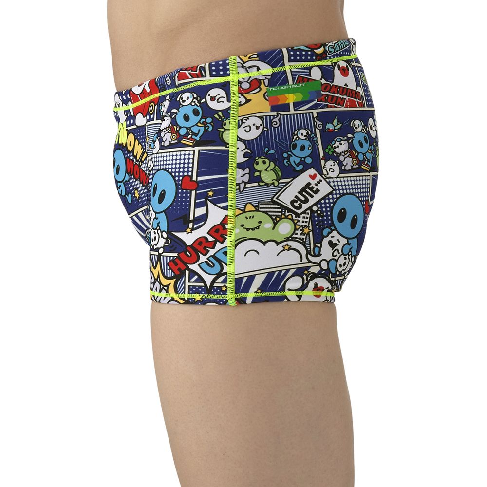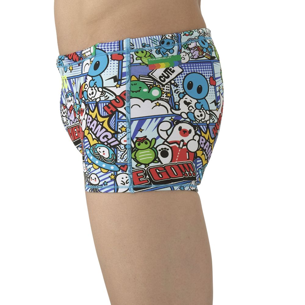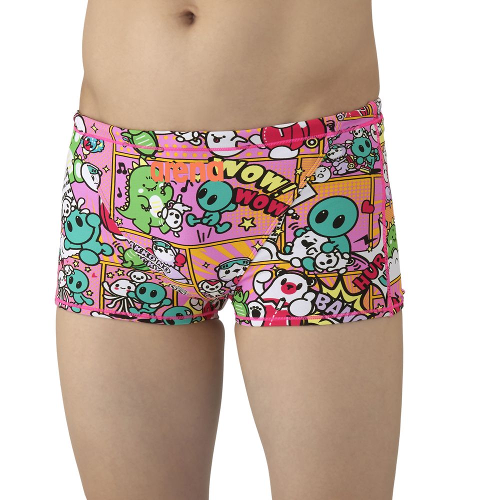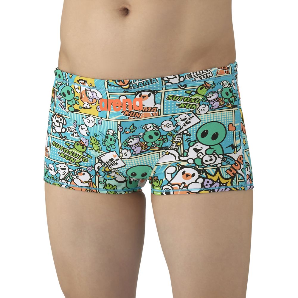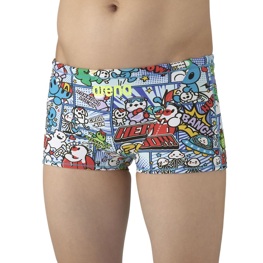 トレーニングカテゴリー「TOUGHSUITシリーズ」。ジュニア用サイズ。大会に向けて練習を重ねる頻度が高いスイマーにオススメの練習用水着。環境に配慮したリサイクルポリエステル素材「タフスキンEP」を使用し塩素に強く長持ち。全てのスイマーに人気のアリーナくんの総柄ショートレッグタイプ。AS5FWM01Mで展開するテーマ(宇宙や地球)と連動する冒険物語。アメリカンコミック調の柄は鮮やかな色合いとダイナミックな線が特徴でインパクトのあるデザイン。アリーナくんたちと地球外生命体(怪獣、宇宙人、お化け)が出会い、友達になる過程をプリントに表現。地球を守る戦隊ヒーロー風のスタイルを取り入れることで、アリーナくんたちのチームとしての一体感を演出。カラフルな4配色の展開。前身頃、後身頃共に黒の裏地付き。*この商品は縫製上、一点一点プリント柄の見え方に違いが生じますので予めご了承ください。