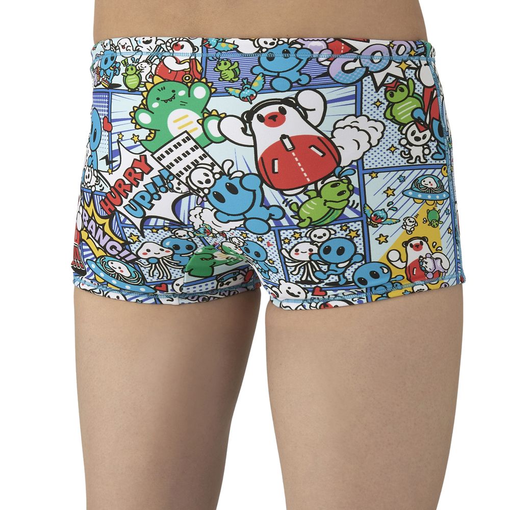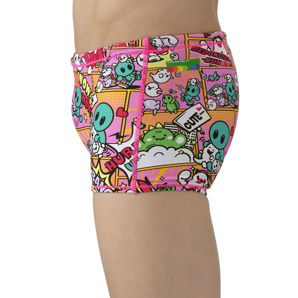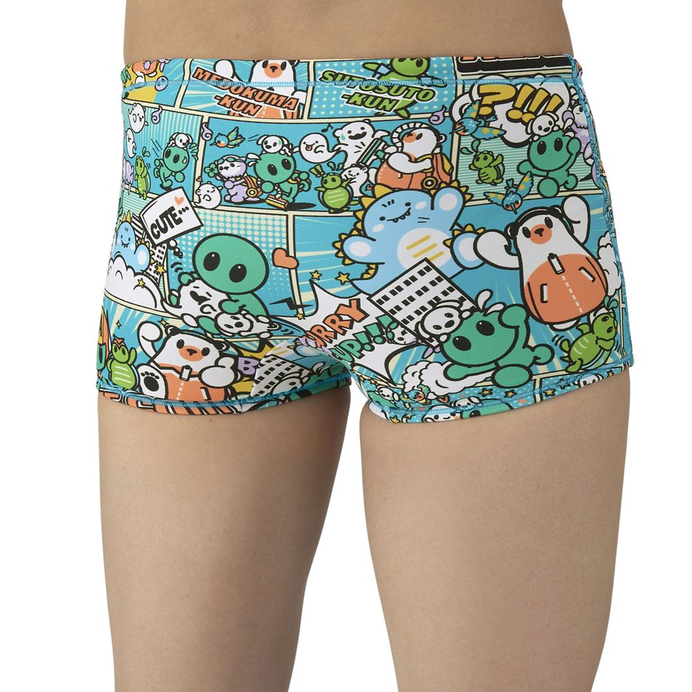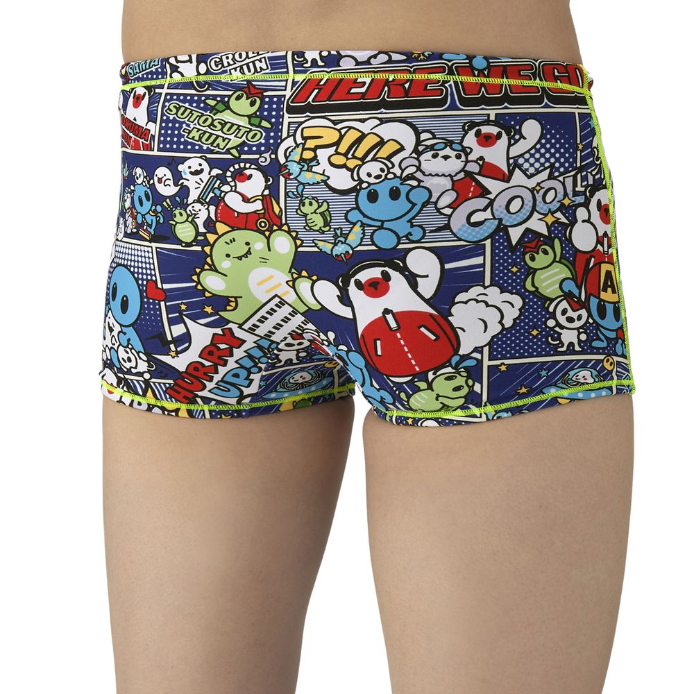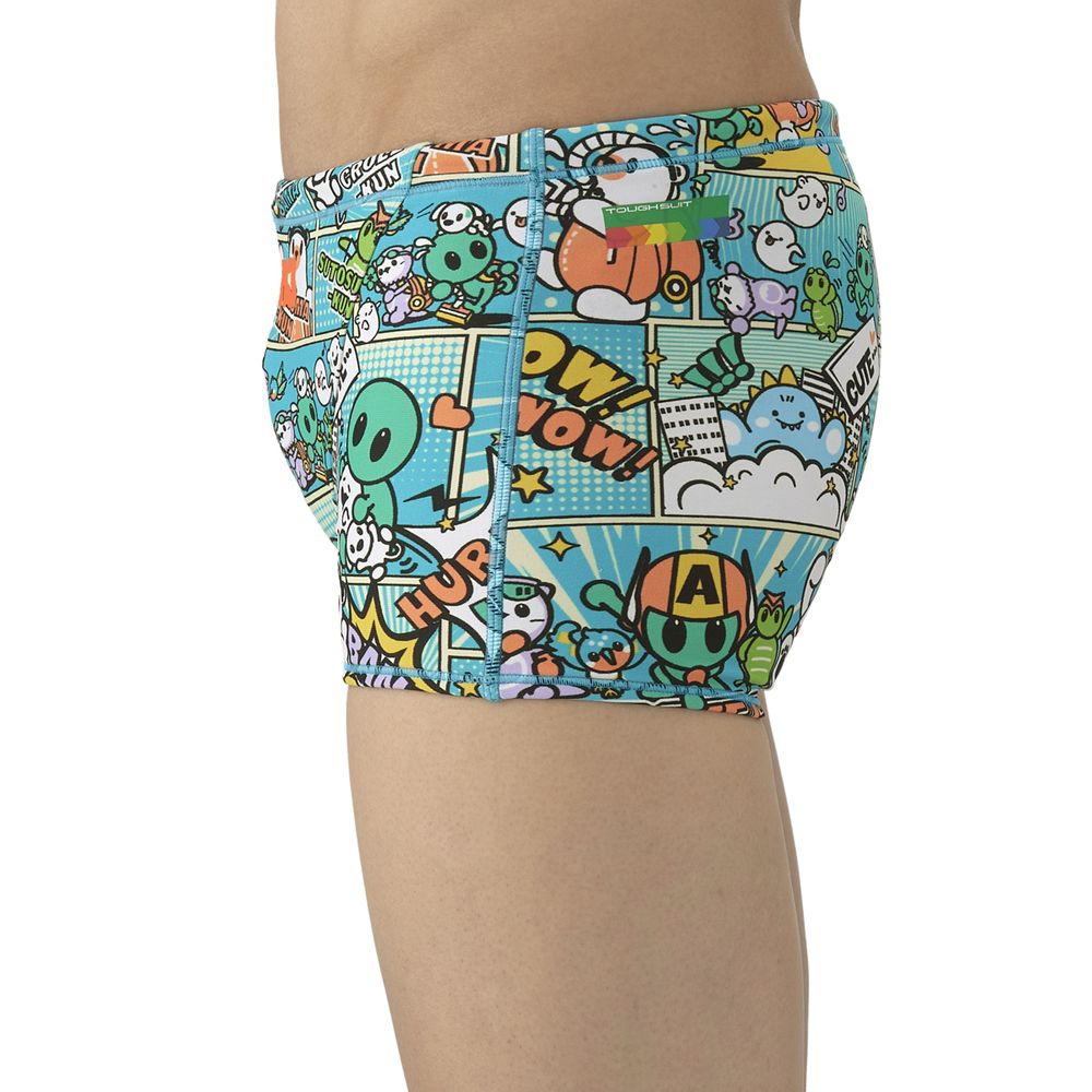 トレーニングカテゴリー「TOUGHSUITシリーズ」。ジュニア用サイズ。大会に向けて練習を重ねる頻度が高いスイマーにオススメの練習用水着。環境に配慮したリサイクルポリエステル素材「タフスキンEP」を使用し塩素に強く長持ち。全てのスイマーに人気のアリーナくんの総柄ショートレッグタイプ。AS5FWM01Mで展開するテーマ(宇宙や地球)と連動する冒険物語。アメリカンコミック調の柄は鮮やかな色合いとダイナミックな線が特徴でインパクトのあるデザイン。アリーナくんたちと地球外生命体(怪獣、宇宙人、お化け)が出会い、友達になる過程をプリントに表現。地球を守る戦隊ヒーロー風のスタイルを取り入れることで、アリーナくんたちのチームとしての一体感を演出。カラフルな4配色の展開。前身頃、後身頃共に黒の裏地付き。*この商品は縫製上、一点一点プリント柄の見え方に違いが生じますので予めご了承ください。