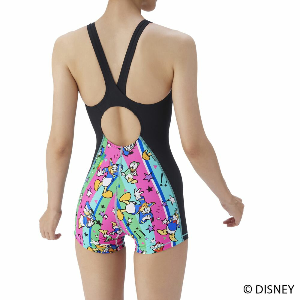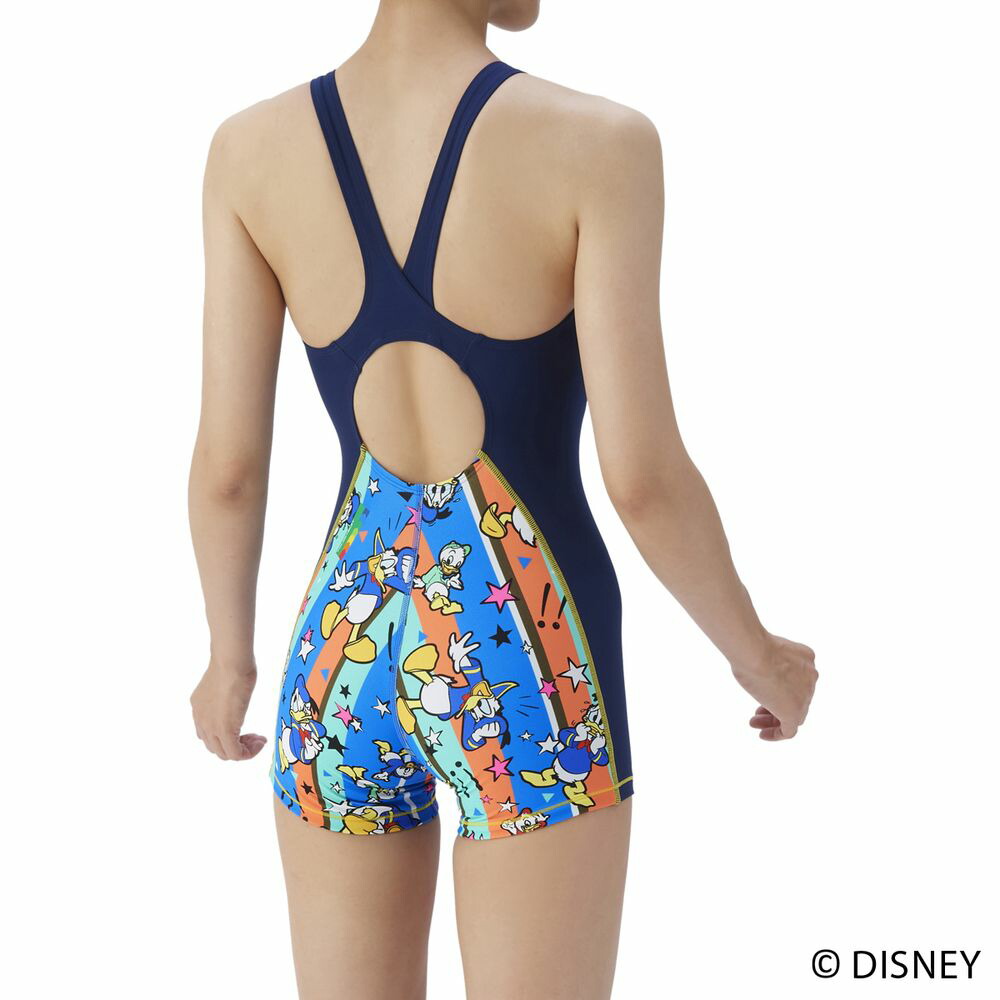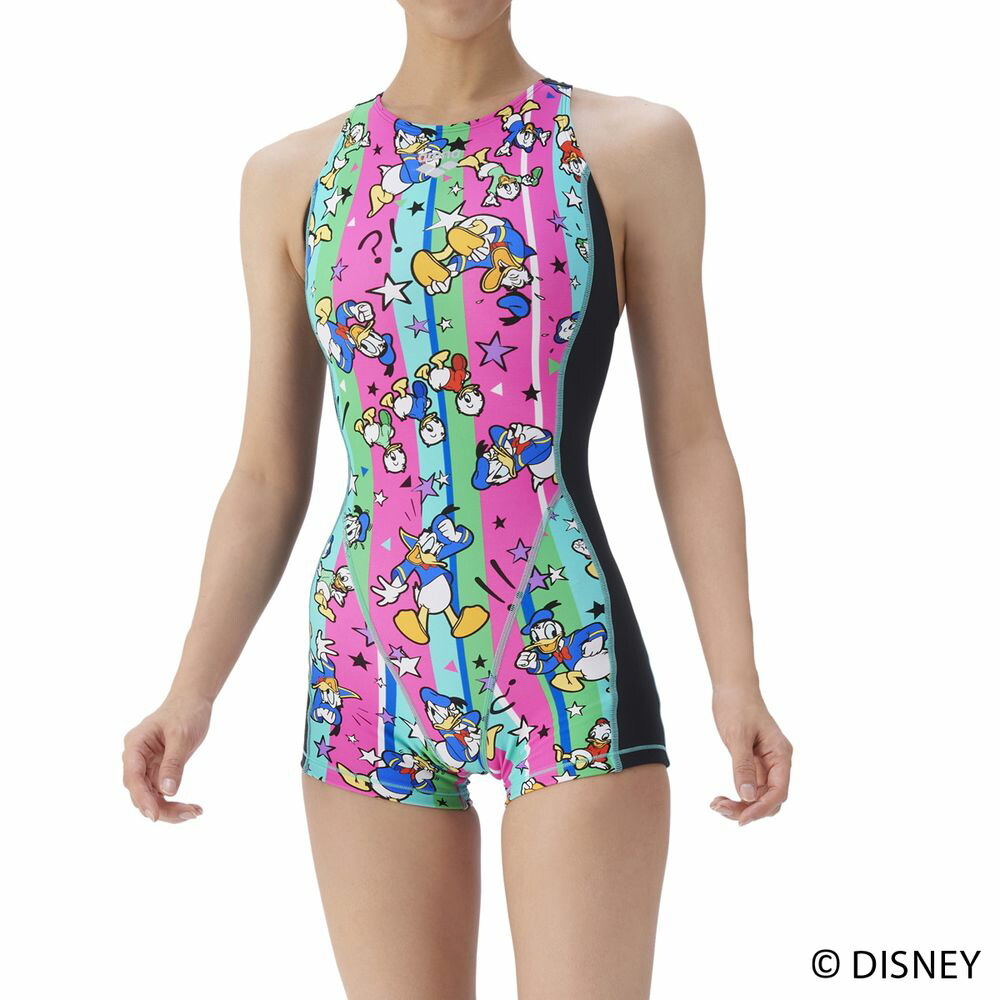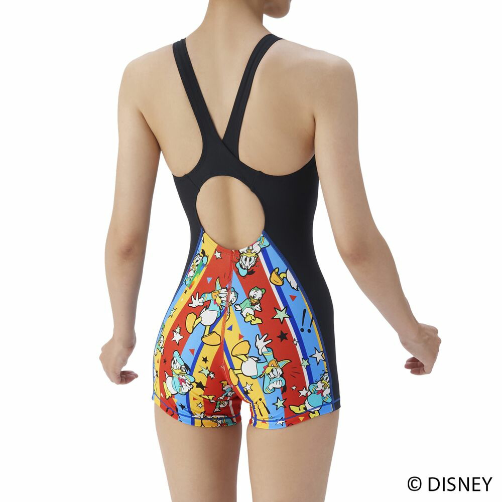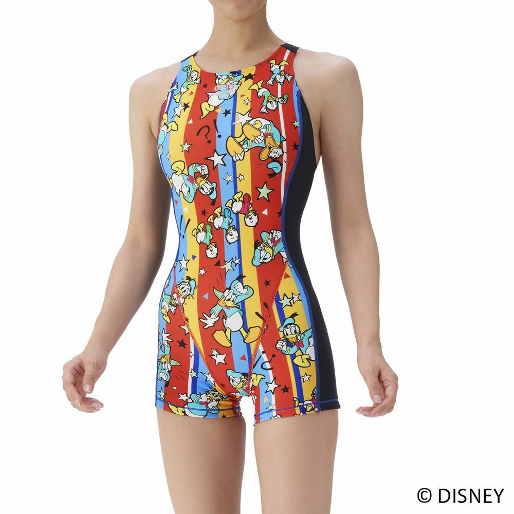 耐久性に優れた TOUGHSUIT(タフスーツ)シリーズの Disney(ディズニー)デザインモデル。環境に配慮したリサイクルポリエステル素材を使用しており、塩素に強く長持ちするため、大会に向けて練習を重ねる頻度が高いスイマーにおすすめのトレーニング(練習)用水着。アリーナオリジナルのミドルレッグ丈で、股周りの露出を抑えるため、安心感と泳ぎやすさの両方を求める方におすすめ。また、大きく開いて着脱がしやすい「着やストラップ」を搭載。様々な表情やポーズをした「ドナルド・ダック」とその甥っ子たち「 ヒューイ・デューイ・ルーイ」が描かれたプリントデザイン。カラフルなストライプ柄に星や記号が描かれたポップで可愛いデザインでトレーニング中の気分もアップ。水着とデザイン連動のメッシュキャップ(AS5FSC81U)やプルーフバッグ(AS5FBZ84U)とのコーディネートもおすすめ。※こちらの水着は、パッドが取り付けられる仕様となっておりますので、別売りひっかけパッドをご購入いただければ、パッドあり水着としてもご着用いただけます。また、この製品は縫製上、一点一点プリント柄の見え方に違いが生じますので予めご了承ください。