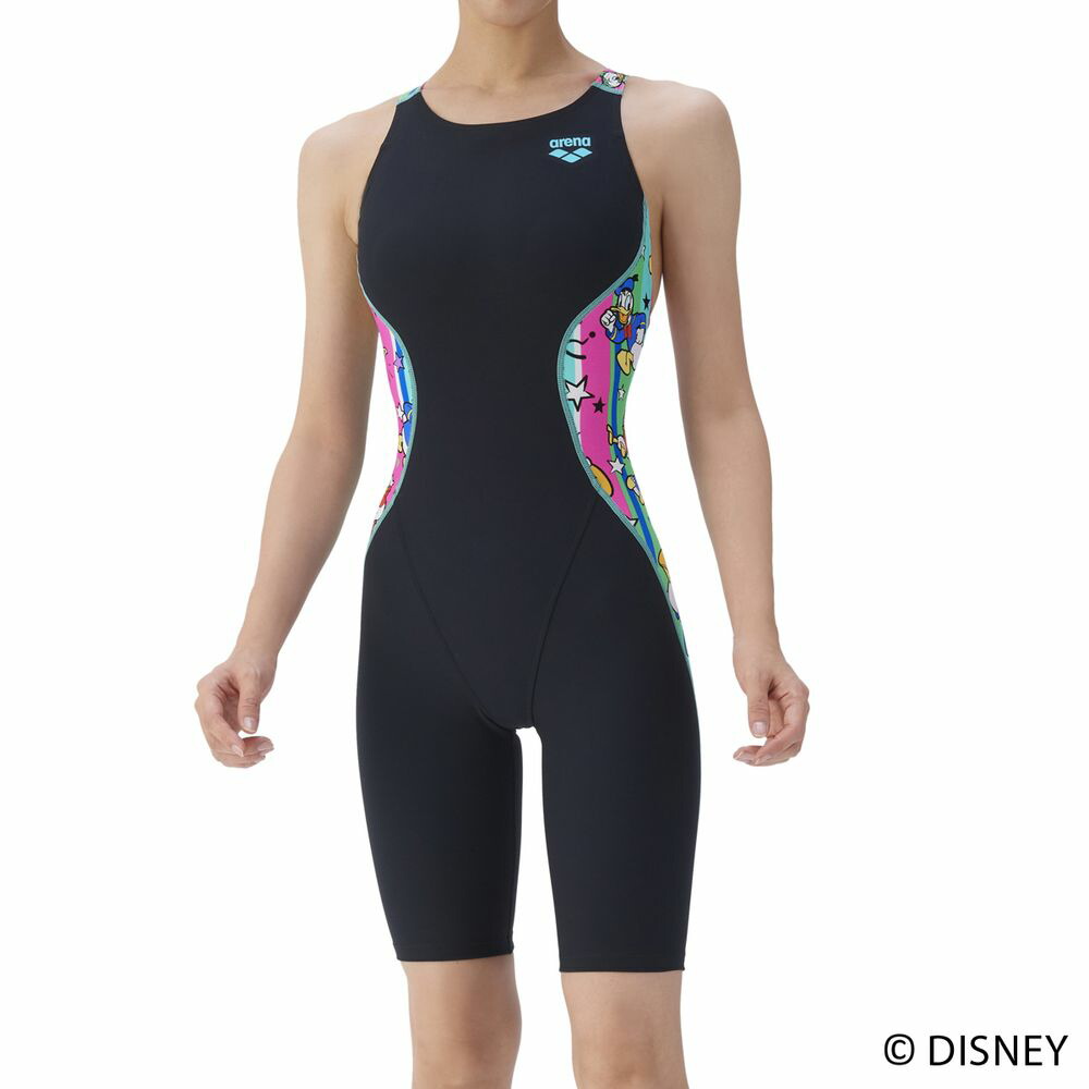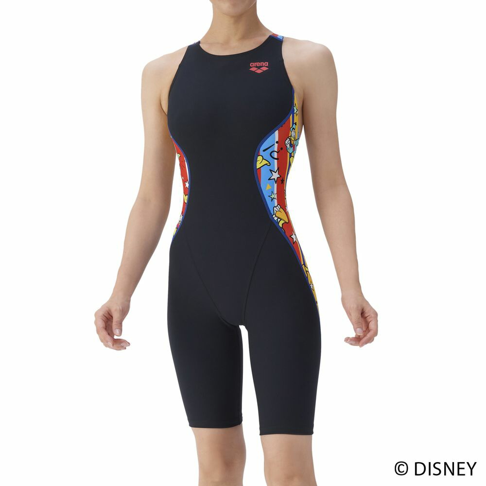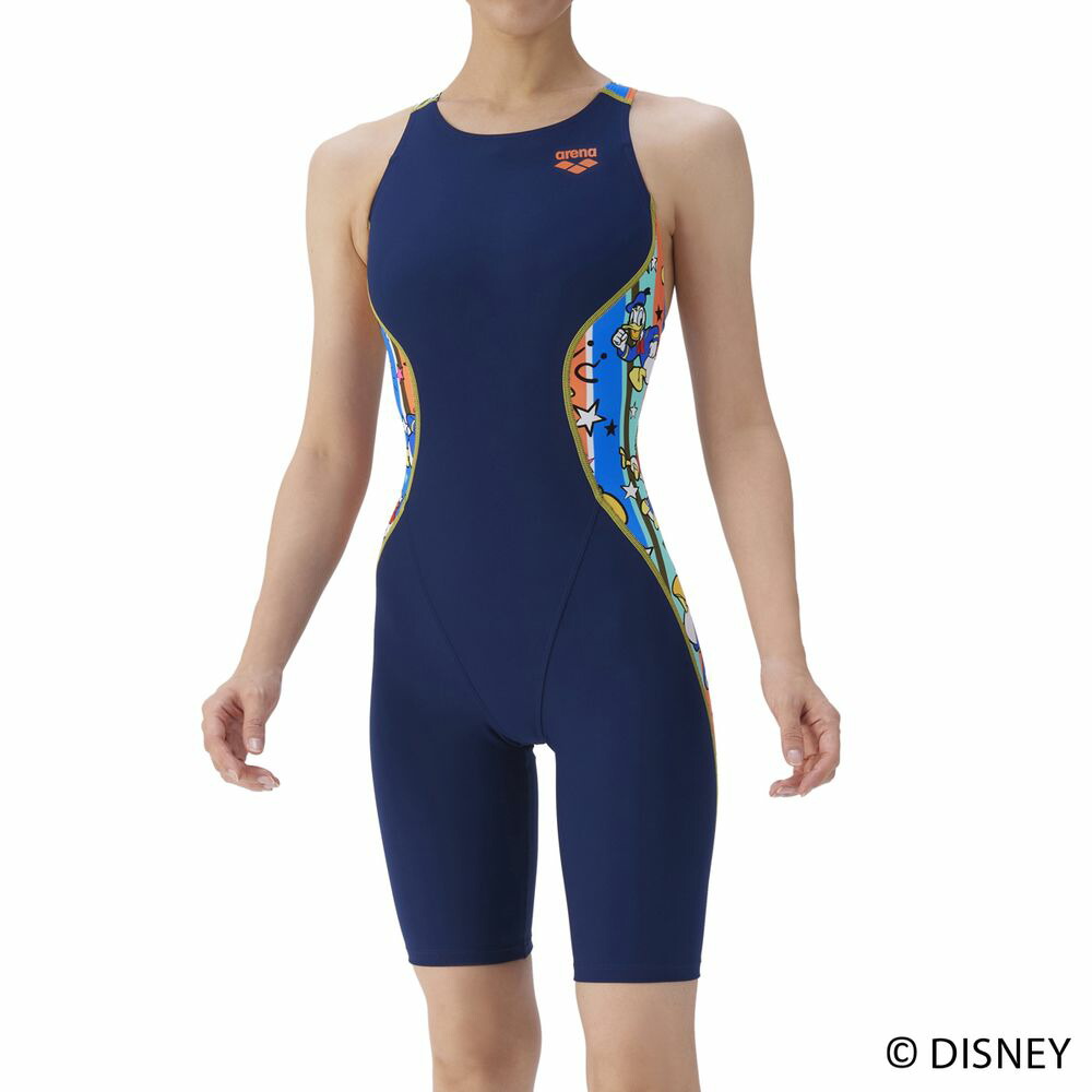 耐久性に優れた TOUGHSUIT(タフスーツ)シリーズの Disney(ディズニー)デザインモデル。環境に配慮したリサイクルポリエステル素材を使用しており、塩素に強く長持ちするため、大会に向けて練習を重ねる頻度が高いスイマーにおすすめのトレーニング(練習)用水着。膝上まで生地があるハーフレッグ丈で、脚の露出を抑えるため、安心感を求める方におすすめ。また、大きく開いて着脱がしやすい「着やストラップ」を搭載。様々な表情やポーズをした「ドナルド・ダック」とその甥っ子たち「 ヒューイ・デューイ・ルーイ」が描かれたプリントデザイン。カラフルなストライプ柄に星や記号が描かれたポップで可愛いデザインでトレーニング中の気分もアップ。水着とデザイン連動のメッシュキャップ(AS5FSC81U)やプルーフバッグ(AS5FBZ84U)とのコーディネートもおすすめ。※こちらの水着は、パッドが取り付けられる仕様となっておりますので、別売りひっかけパッドをご購入いただければ、パッドあり水着としてもご着用いただけます。また、この製品は縫製上、一点一点プリント柄の見え方に違いが生じますので予めご了承ください。