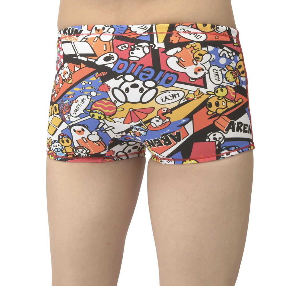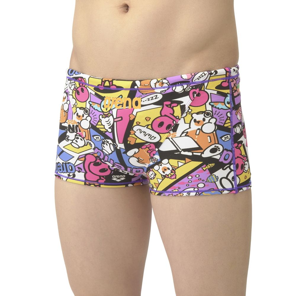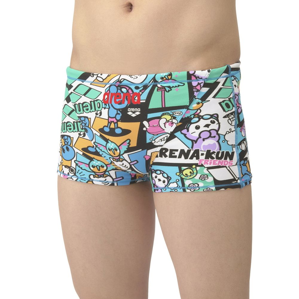トレーニングカテゴリー「TOUGHSUITシリーズ」。大会に向けて練習を重ねる頻度が高いスイマーにオススメの練習用水着。環境に配慮したリサイクルポリエステル素材「タフスキンEP」を使用し塩素に強く長持ち。全てのスイマーに人気のアリーナくんの総柄ショートレッグタイプ水着。アリーナくんと仲間たちをカラフルに4配色で表現。*前身頃、後身頃に黒の裏地付き。*この商品は縫製上、一点一点プリント柄の見え方に違いが生じますので予めご了承ください。