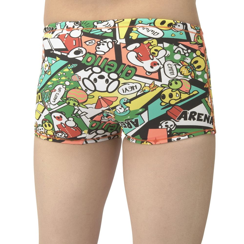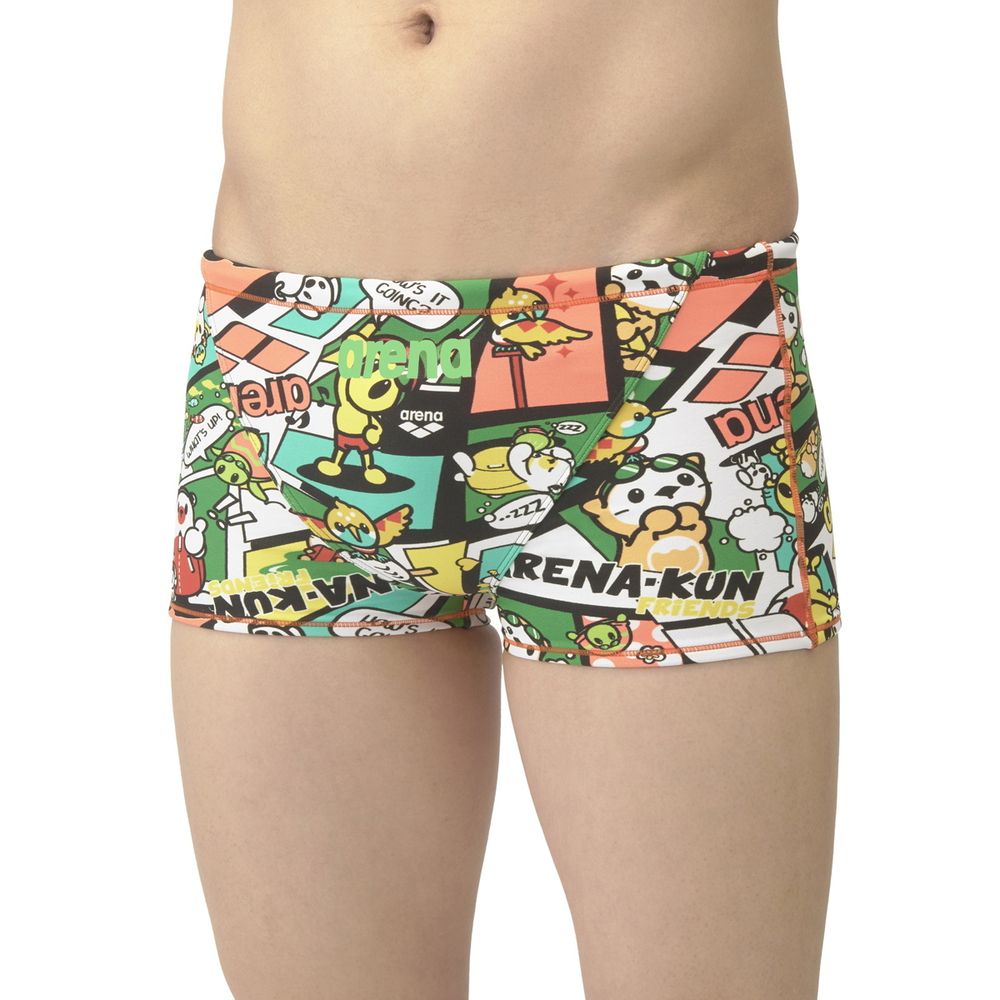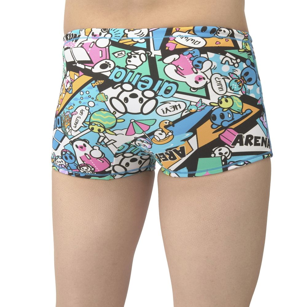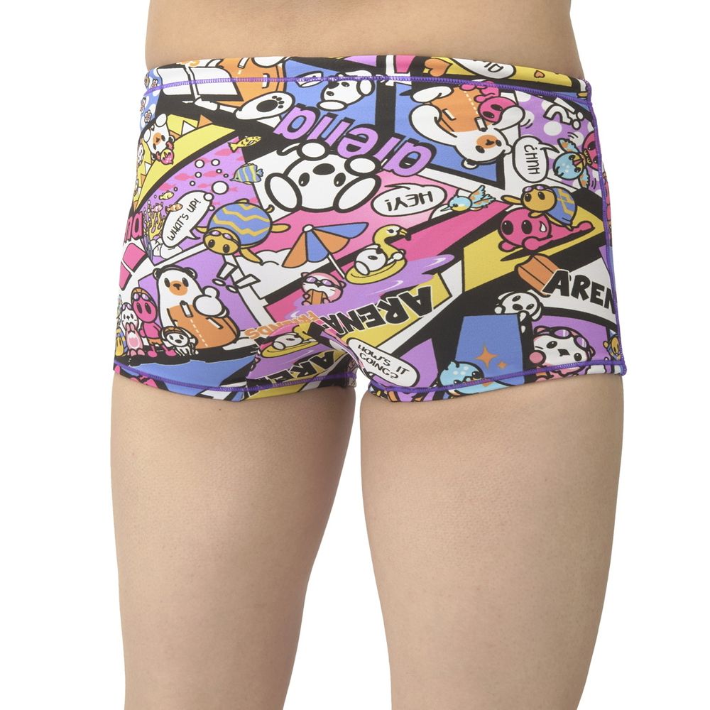 トレーニングカテゴリー「TOUGHSUITシリーズ」。大会に向けて練習を重ねる頻度が高いスイマーにオススメの練習用水着。環境に配慮したリサイクルポリエステル素材「タフスキンEP」を使用し塩素に強く長持ち。全てのスイマーに人気のアリーナくんの総柄ショートレッグタイプ水着。アリーナくんと仲間たちをカラフルに4配色で表現。*前身頃、後身頃に黒の裏地付き。*この商品は縫製上、一点一点プリント柄の見え方に違いが生じますので予めご了承ください。