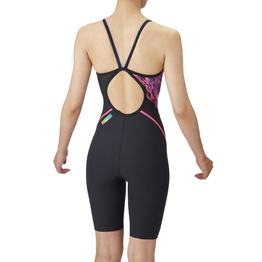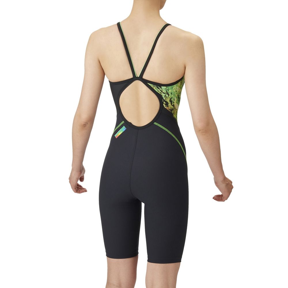 トレーニングカテゴリー「TOUGHSUITシリーズ」。大会に向けて練習を重ねる頻度が高いスイマーにオススメの練習用水着。環境に配慮したリサイクルポリエステル素材「タフスキンE及びT2E」を使用し塩素に強く長持ち。シーズンテーマのWATER ILLUSIONのハーフレッグタイプ水着。胸元のプリントが鮮やかで顔周りを明るく見せてくれるデザイン。前身頃に黒の裏地付き。