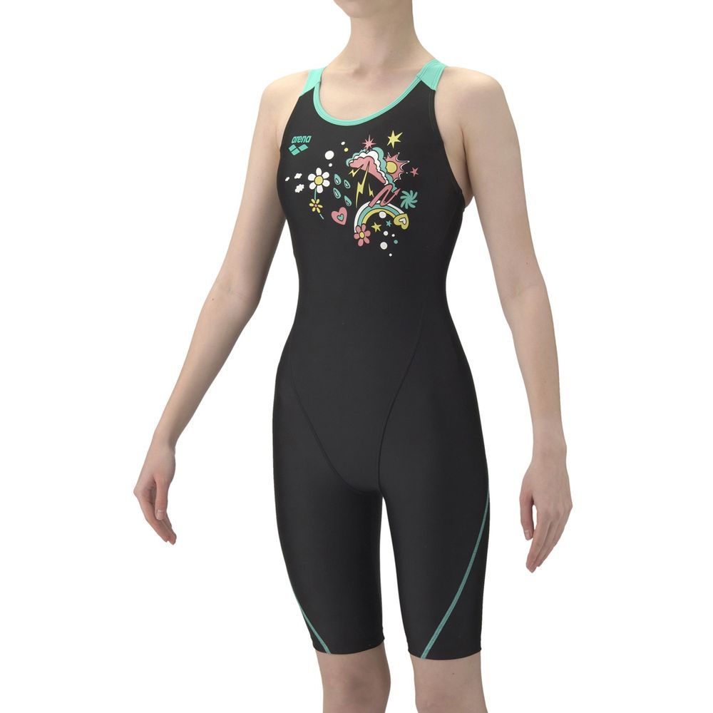 【AQUA EXA - アクアエクサ】「泳ぎやすさ」を追求したフィットネス水着、AQUA EXA(アクアエクサ)シリーズ。上達を目指すフィットネススイマーにおすすめ。あきの少ないオープンバックタイプで、背中の露出を抑えつつ、水が抜けるため泳ぎやすい。膝上まで生地があるハーフレッグ丈で、脚の露出を抑えるため、安心感を求める方におすすめ。大きく開いて着脱がしやすい「着やストラップ」搭載。はっ水生地を使用しており、シャープな水きれで軽い泳ぎ心地が特徴。パッドは「ぴったりパッド」を使用しており、水着に縫い込まれているため、水の中でもズレにくくフィット感を重視する方におすすめ。26SS アリーナシーズンテーマ「VIBRANT WEATHER」デザイン。私たちの生活や健康に大きな影響を与える天候の変化をラバープリントで表現したデザイン。ポップで鮮やかな色彩のモチーフは、プールでのエクササイズを楽しく感じさせてくれるようなデザイン。※効果や使用感には個人差があります。また、肩紐部分、切り替え部分ははっ水が施されていない場合があります。