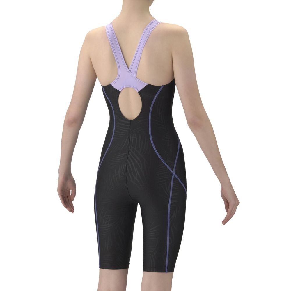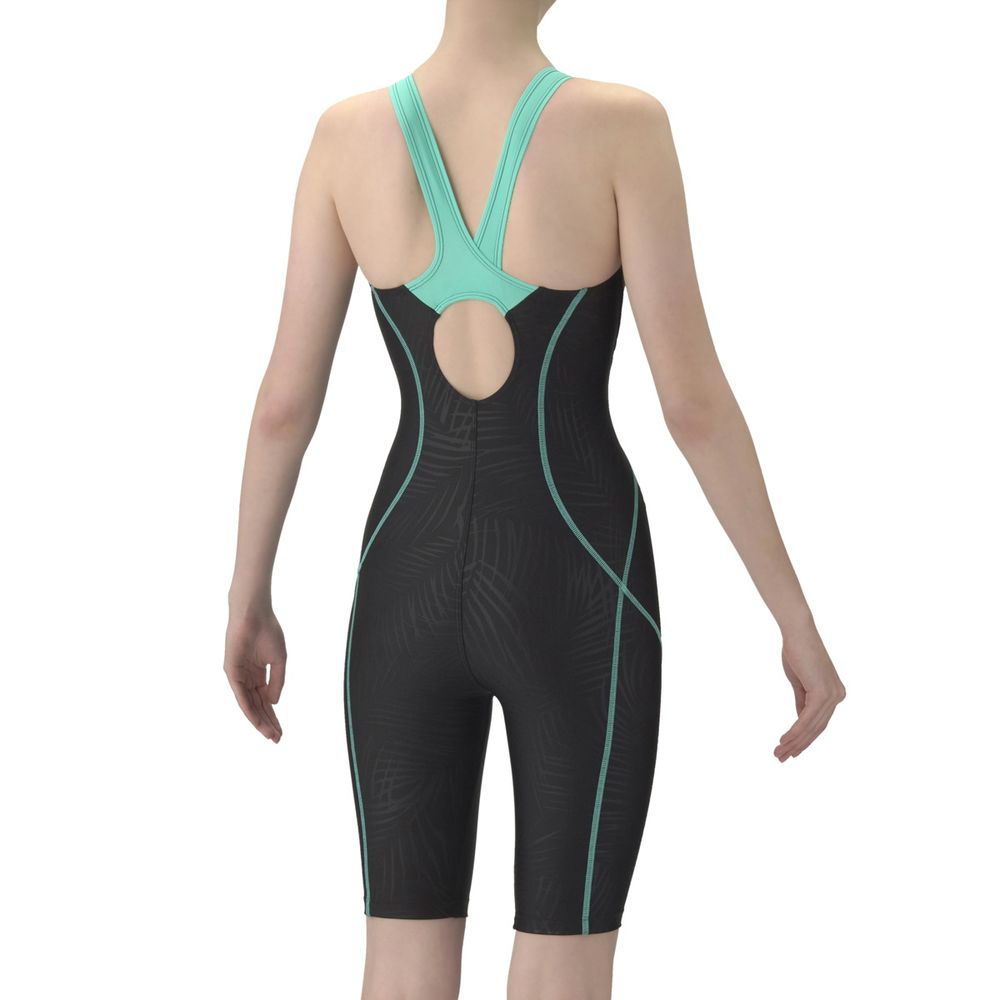 【AQUA EXA - アクアエクサ】「泳ぎやすさ」を追求したフィットネス水着、AQUA EXA(アクアエクサ)シリーズ。上達を目指すフィットネススイマーにおすすめ。あきの少ないオープンバックタイプで、背中の露出を抑えつつ、水が抜けるため泳ぎやすい。膝上まで生地があるハーフレッグ丈で、脚の露出を抑えるため、安心感を求める方におすすめ。大きく開いて着脱がしやすい「着やストラップ」搭載。はっ水生地を使用しており、シャープな水きれで軽い泳ぎ心地が特徴。パッドは「ぴったりパッド」を使用しており、水着に縫い込まれているため、水の中でもズレにくくフィット感を重視する方におすすめ。リーフをモチーフにした地模様がボディラインをカバーし、2色使いのステッチとの組み合わせがシンプルでスタイリッシュな印象を演出。※効果や使用感には個人差があります。また、肩紐部分、切り替え部分ははっ水が施されていない場合があります。