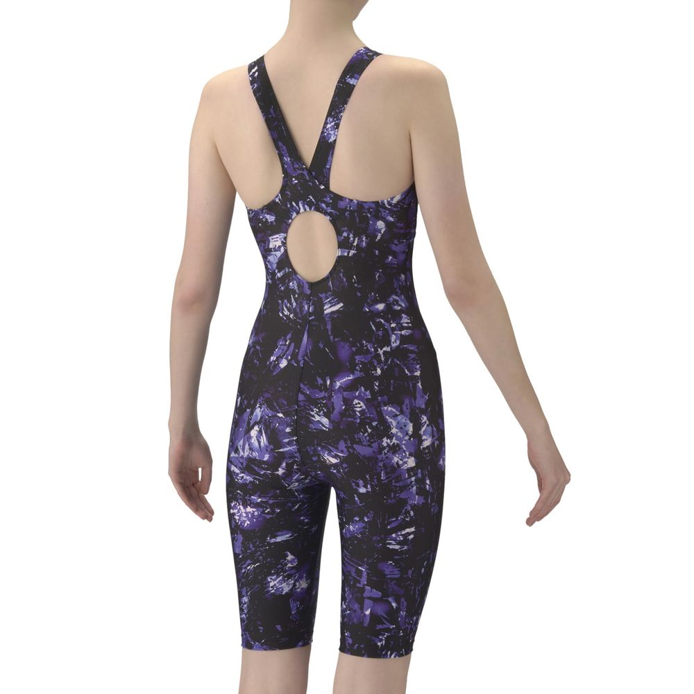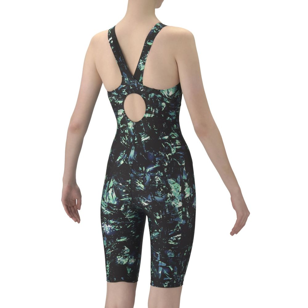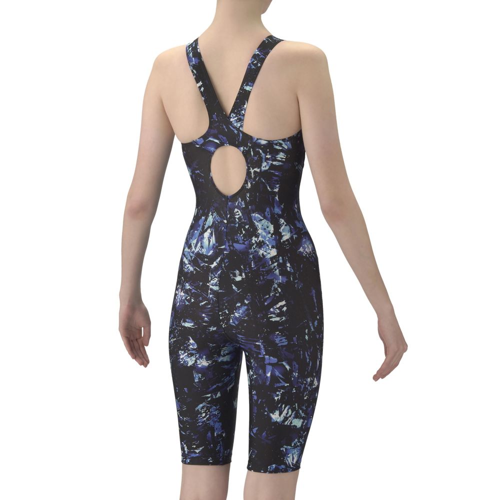 【AQUA EXA - アクアエクサ】「泳ぎやすさ」を追求したフィットネス水着、AQUA EXA(アクアエクサ)シリーズ。上達を目指すフィットネススイマーにおすすめ。あきの少ないオープンバックタイプで、背中の露出を抑えつつ、水が抜けるため泳ぎやすい。膝上まで生地があるハーフレッグ丈で、脚の露出を抑えるため、安心感を求める方におすすめ。大きく開いて着脱がしやすい「着やストラップ」搭載。はっ水生地を使用しており、シャープな水きれで軽い泳ぎ心地が特徴。パッドは「ぴったりパッド」を使用しており、水着に縫い込まれているため、水の中でもズレにくくフィット感を重視する方におすすめ。氷をイメージした幾何柄のプリントを水着全面で表現したデザイン。かっこよく、華やかな水着をお求めの方におすすめ。※効果や使用感には個人差があります。