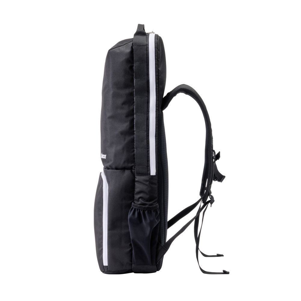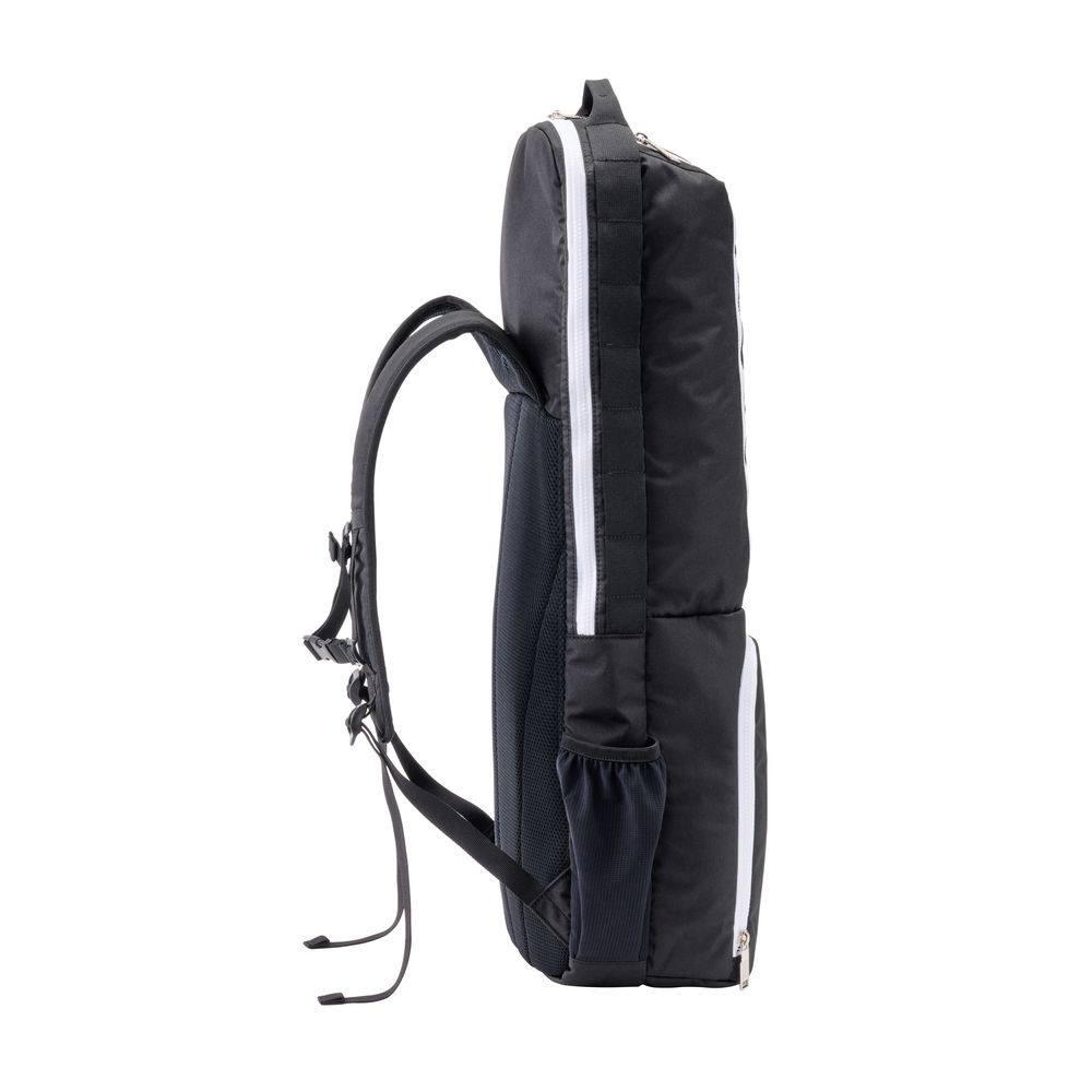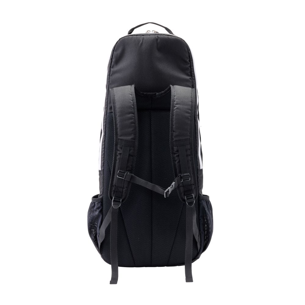 機能:ラケット収納スペース、フラップ式シューズスペース、内側収納ポケット、ドリンクホルダーサイドポケット、アクセサリーポケット、背面メッシュパッド、チェストベルト、ギアループ