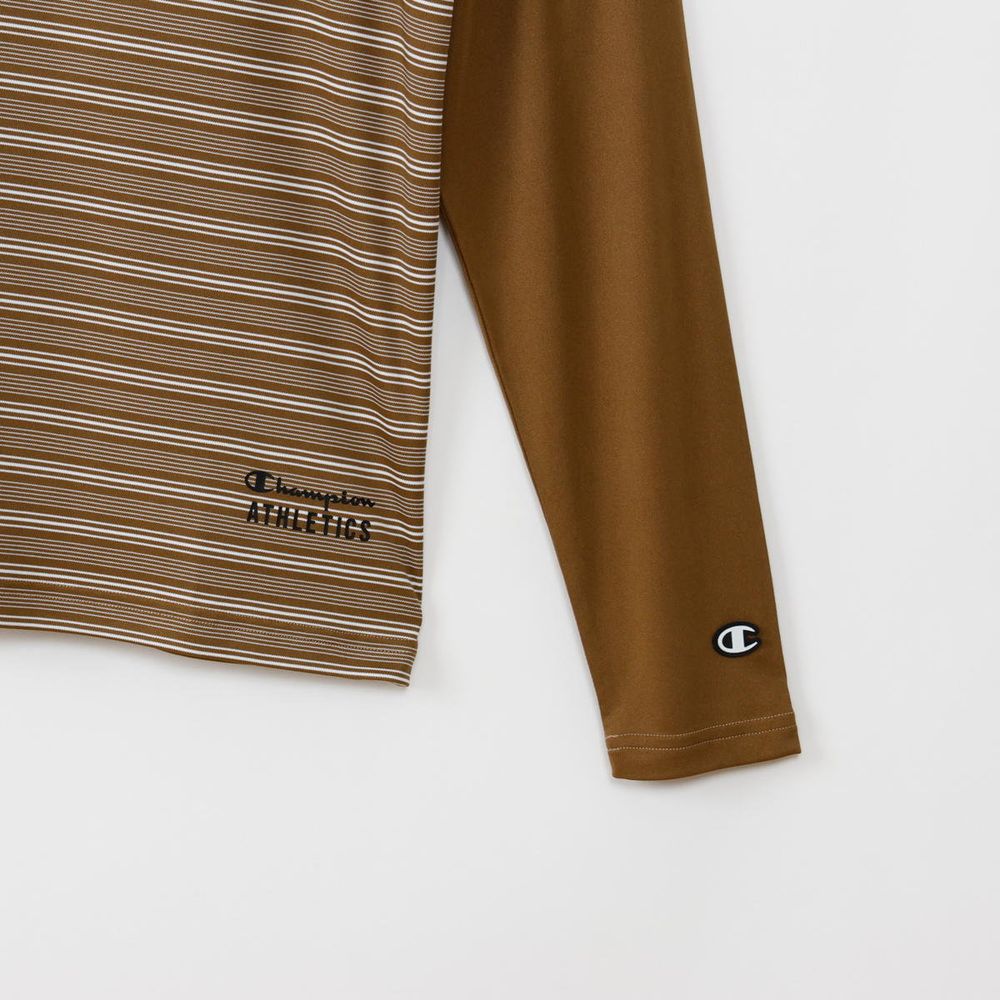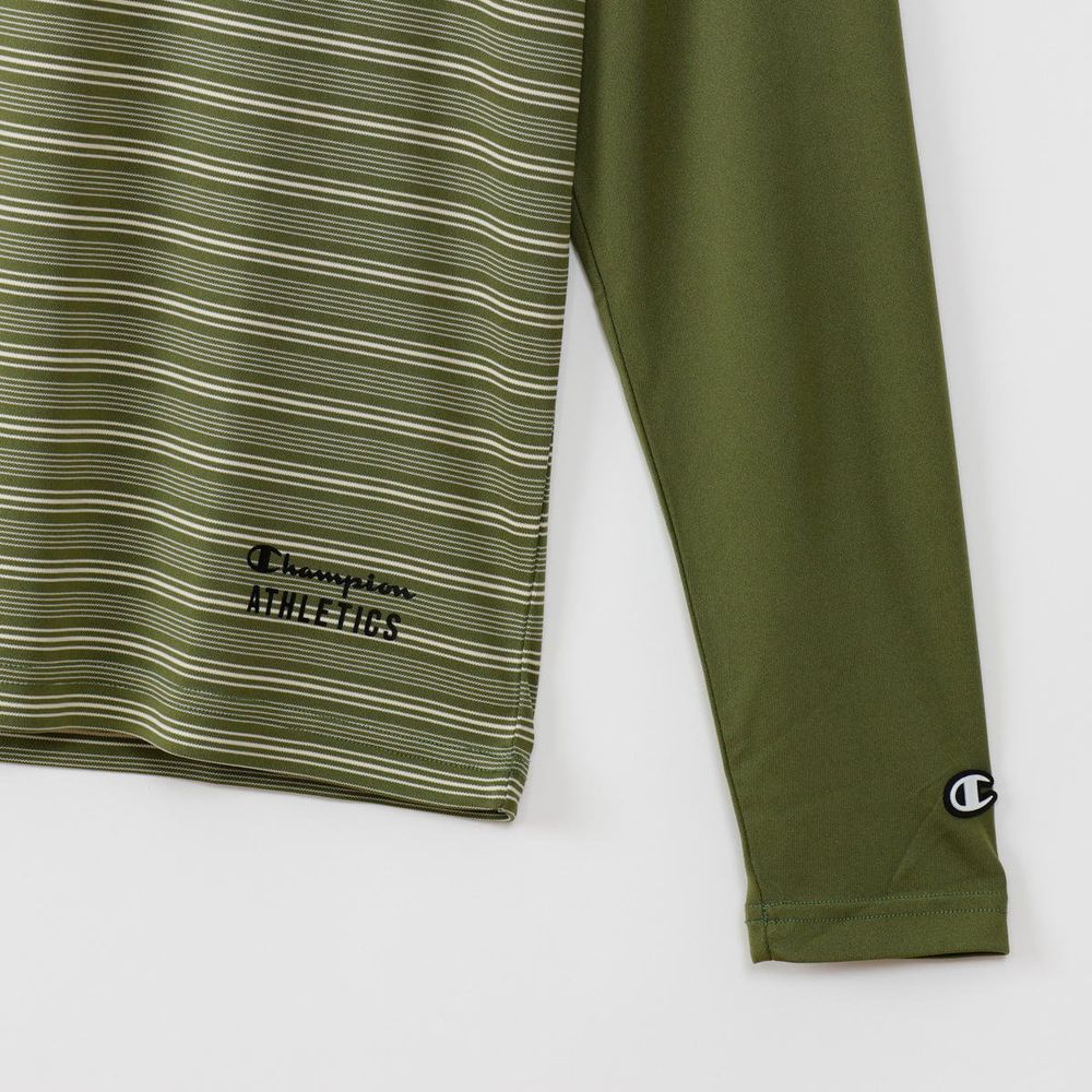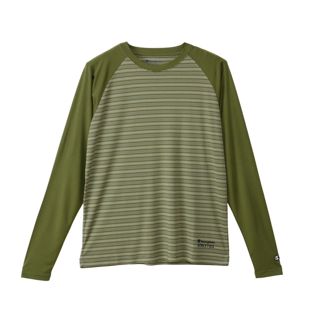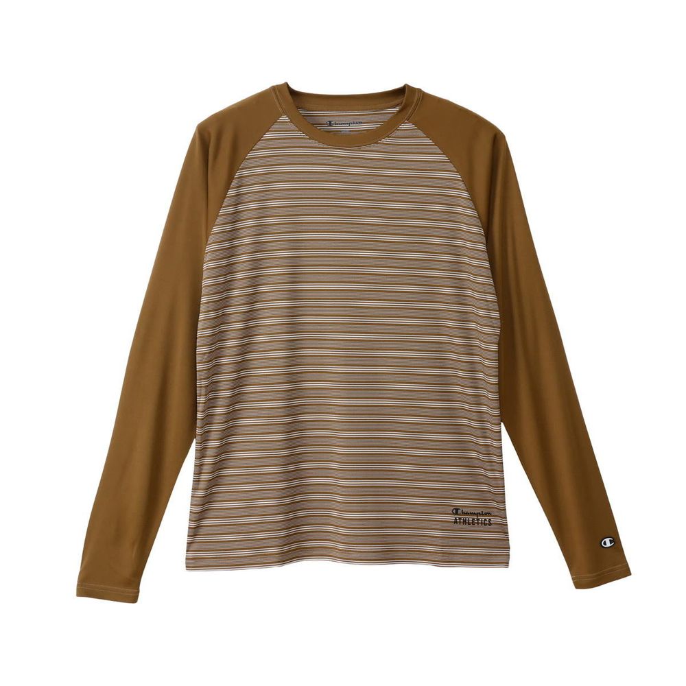 ●速乾性、ストレッチ性に優れ、UVカット機能を備えた「Stretch Stripe Jersey」を使用したロングスリーブTシャツです。肩の動きをスムーズにするラグランスリーブで、襟と袖をボディカラーと同系色の無地で揃えた特徴的なデザイン。左裾にChampion(R)(チャンピオン)ロゴと「ATHLETICS(アスレチックス)」を組み合わせてラバープリントで入れています。●FEATURES:・ Rubber Print