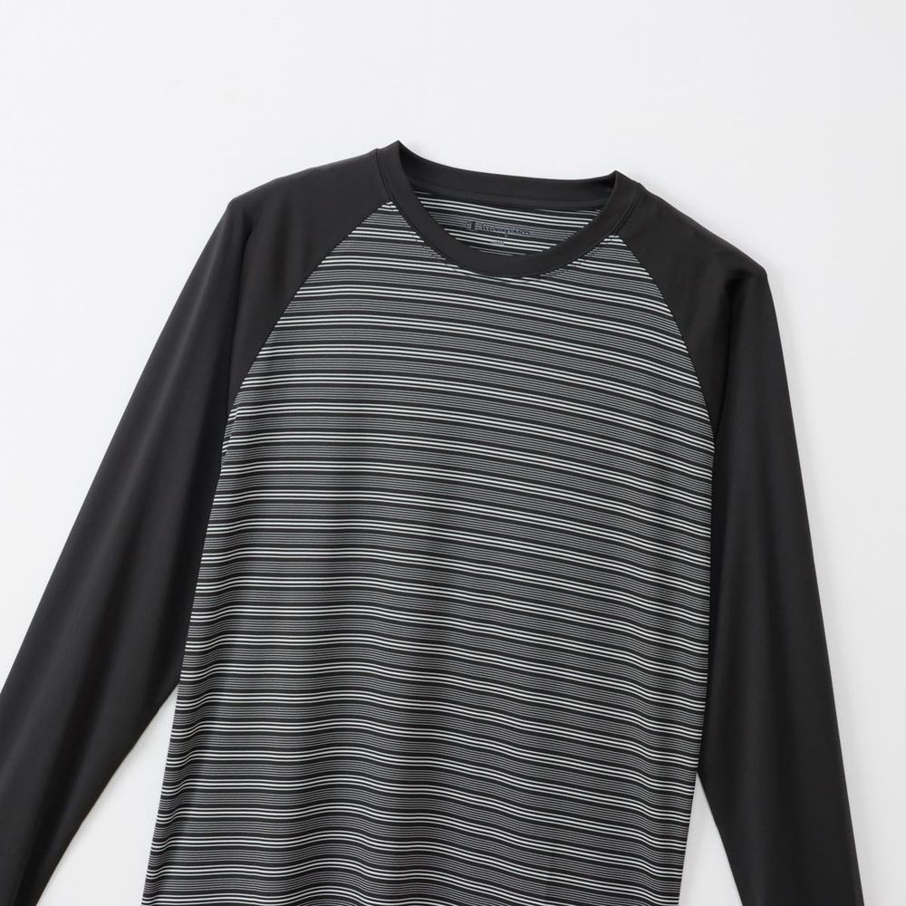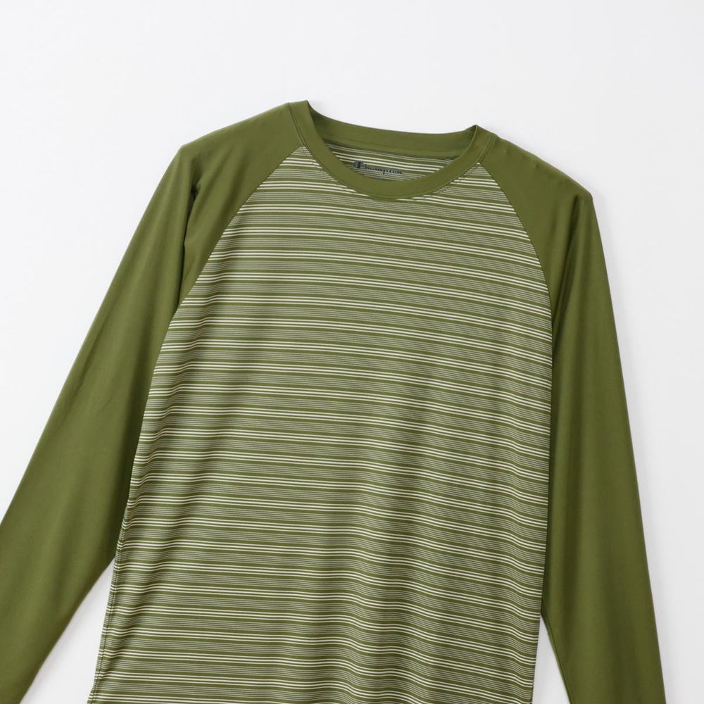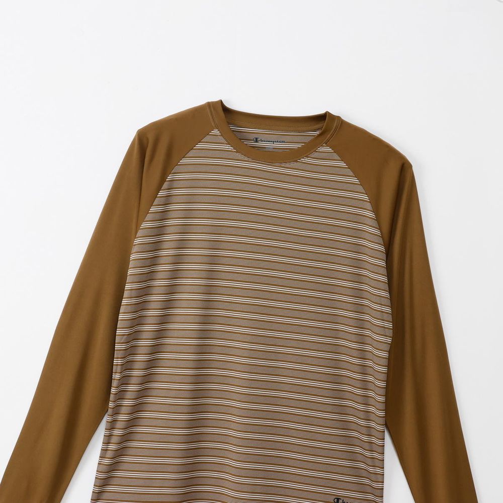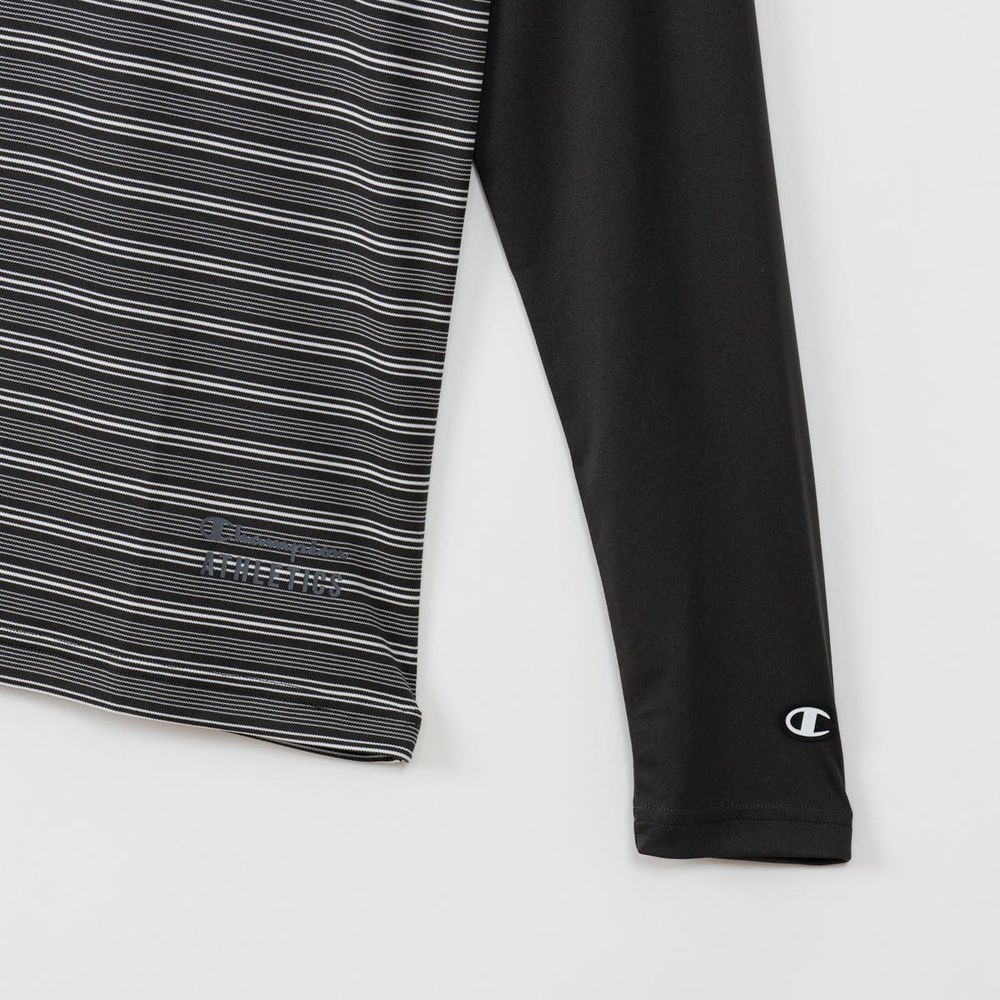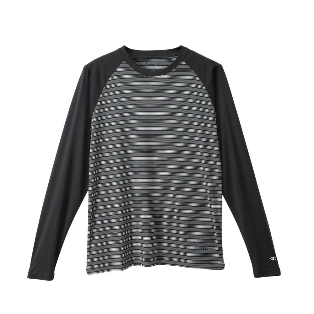 ●速乾性、ストレッチ性に優れ、UVカット機能を備えた「Stretch Stripe Jersey」を使用したロングスリーブTシャツです。肩の動きをスムーズにするラグランスリーブで、襟と袖をボディカラーと同系色の無地で揃えた特徴的なデザイン。左裾にChampion(R)(チャンピオン)ロゴと「ATHLETICS(アスレチックス)」を組み合わせてラバープリントで入れています。●FEATURES:・ Rubber Print