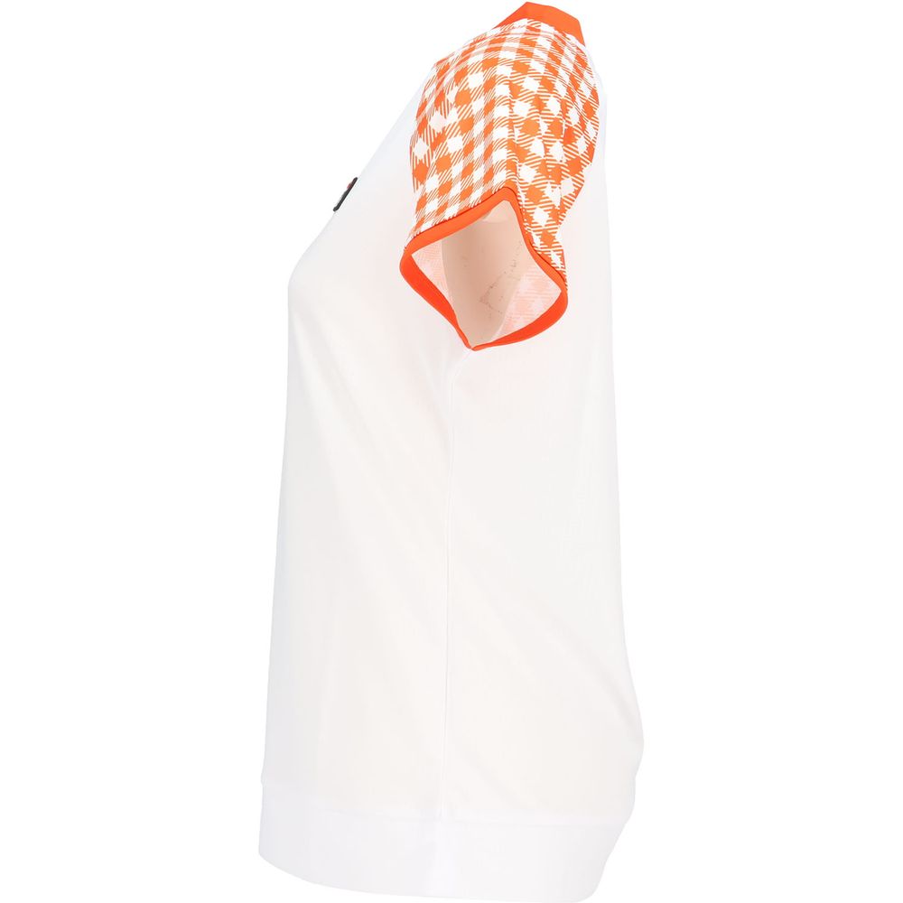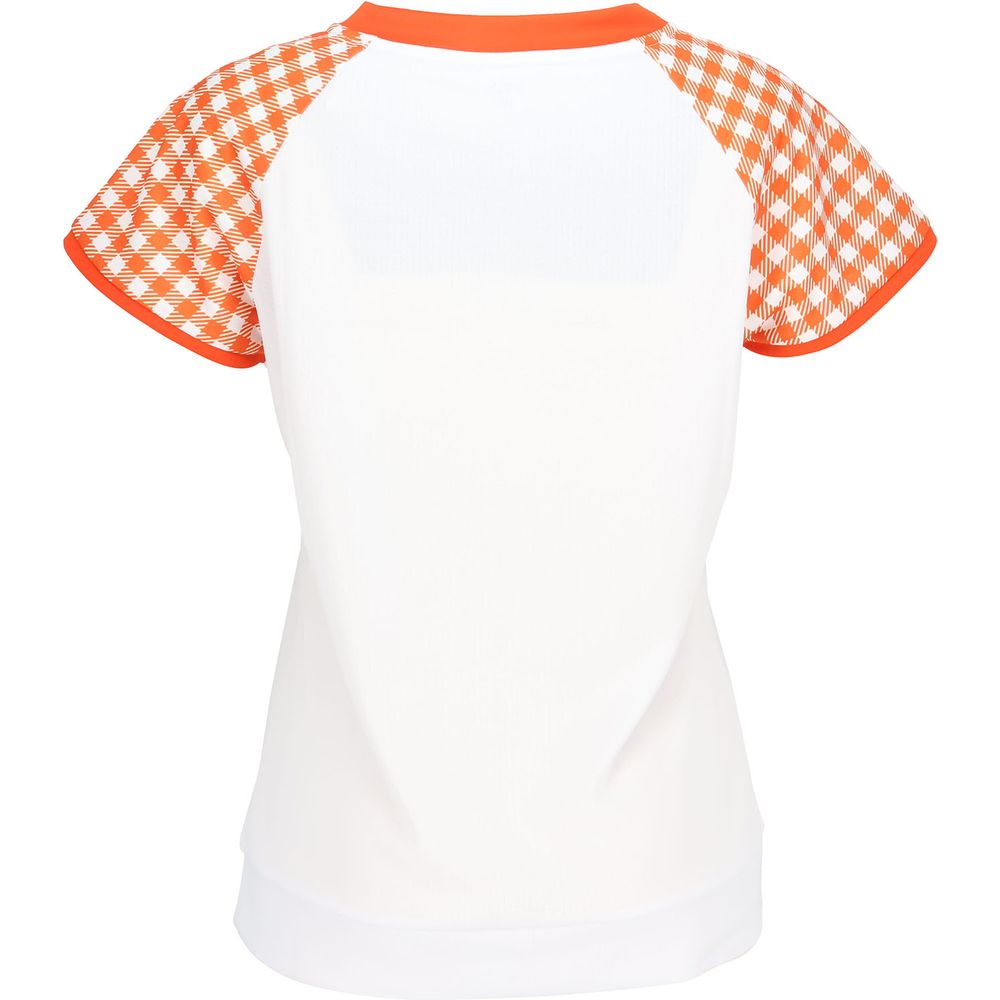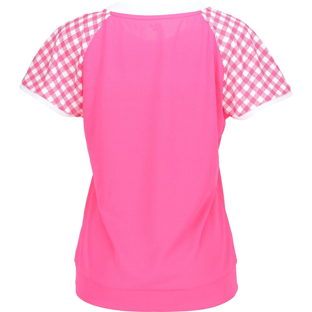 無地部分のボディが汗染み防止素材です。袖のフレアーに対してボディが無地なので引き締まった印象のシャツです。ぜひ同柄のスコートとコーディネートしてください。