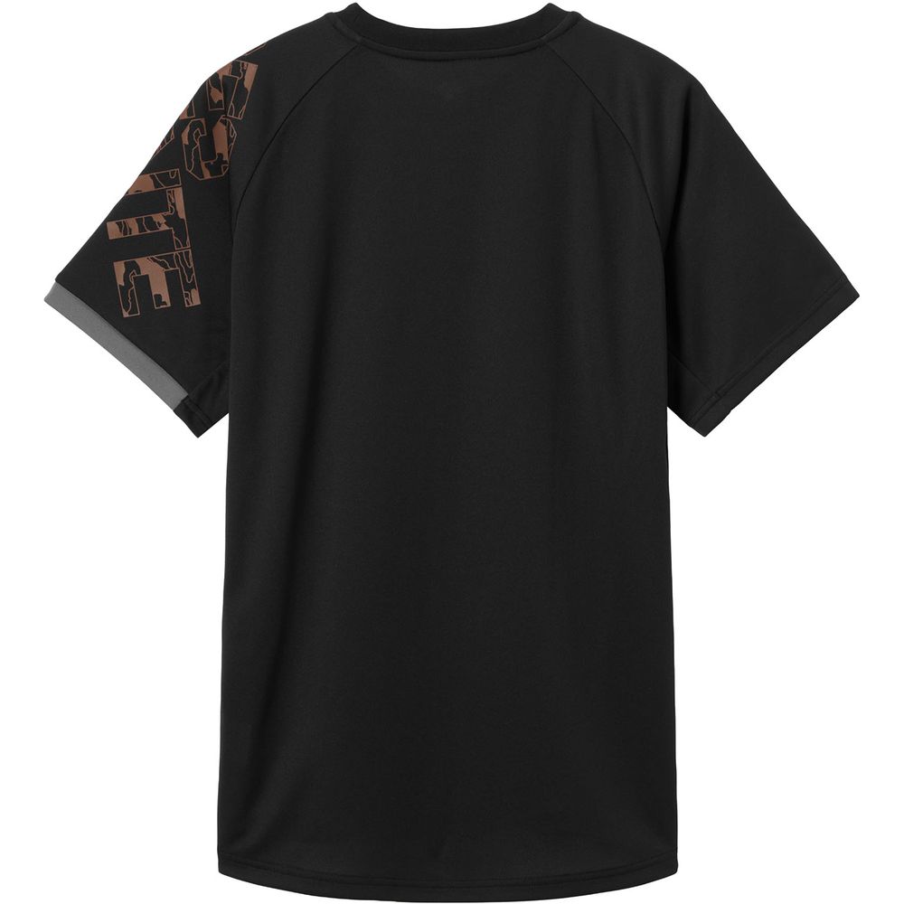腕の振り上げ動作を妨げない脇パーツの構造を採用しています。肩口のグラフィックプリントと袖口の配色がデザインアクセントになっています。