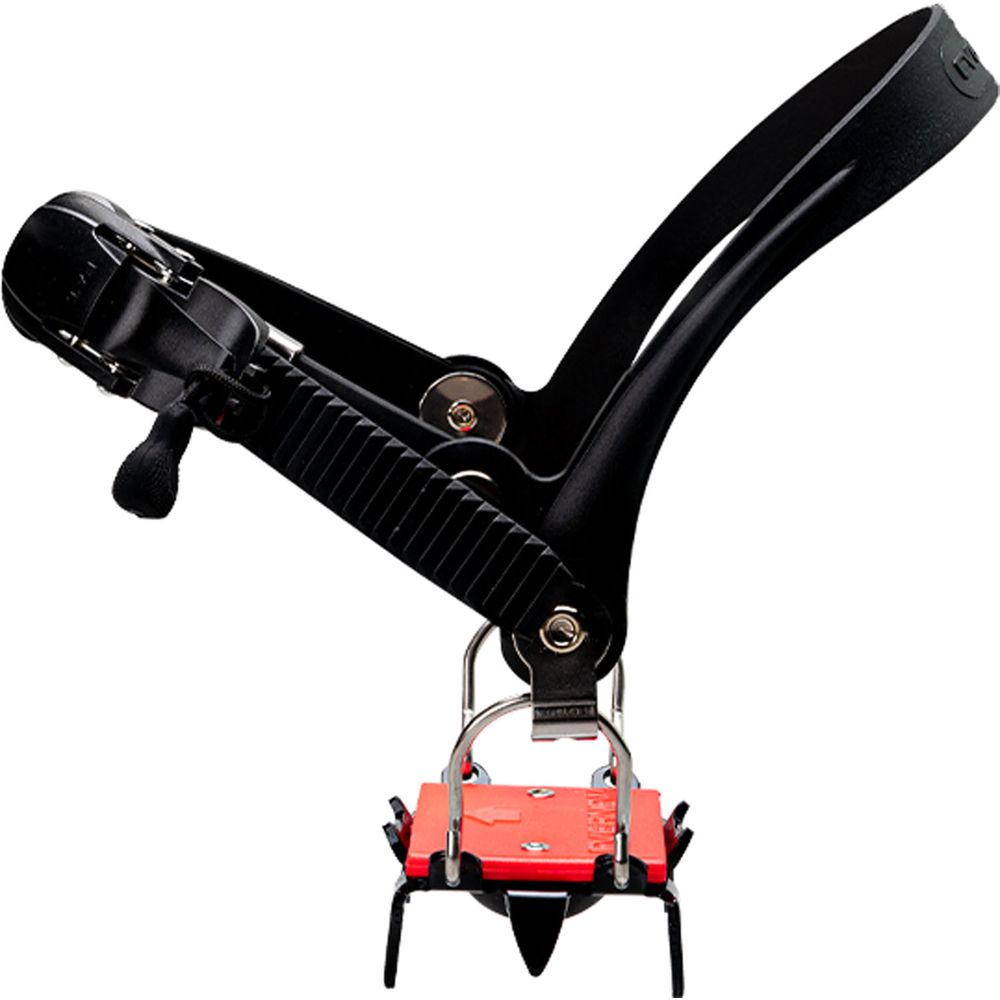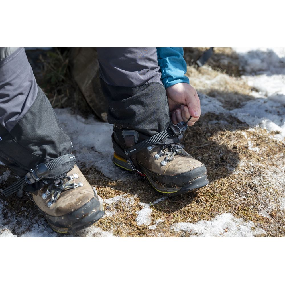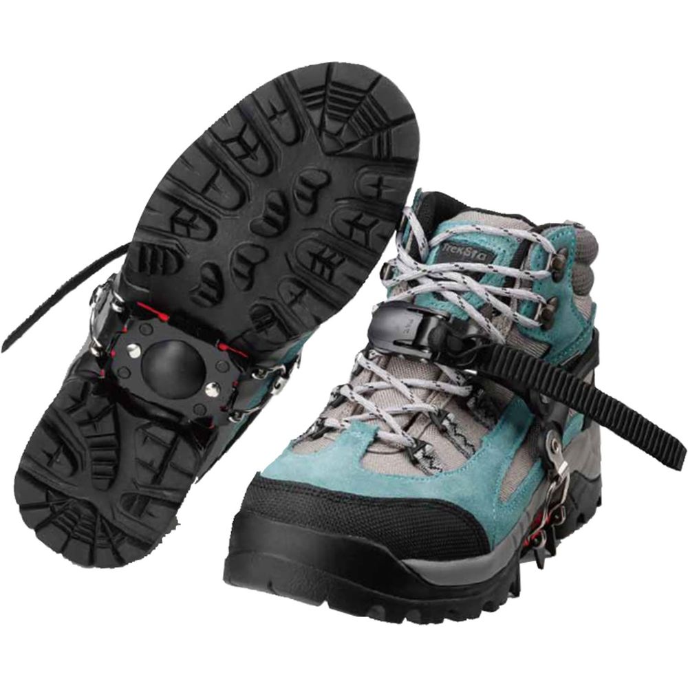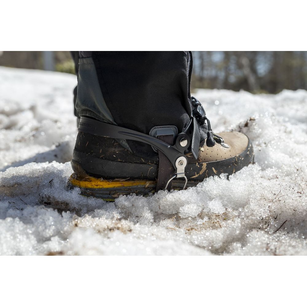 ラチェットベルトで簡単に脱着できる4本爪アイゼン。雪ダンゴ防止のスノープレート付。