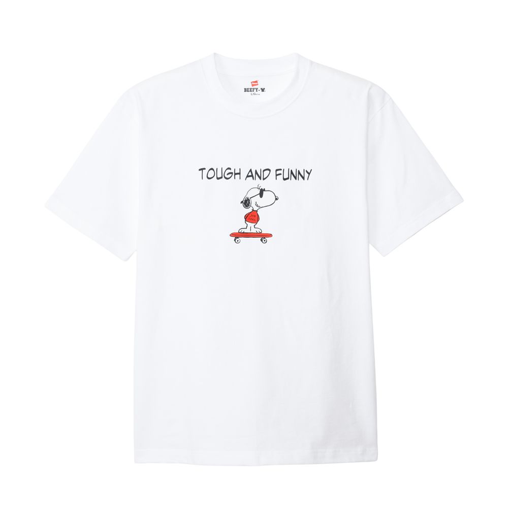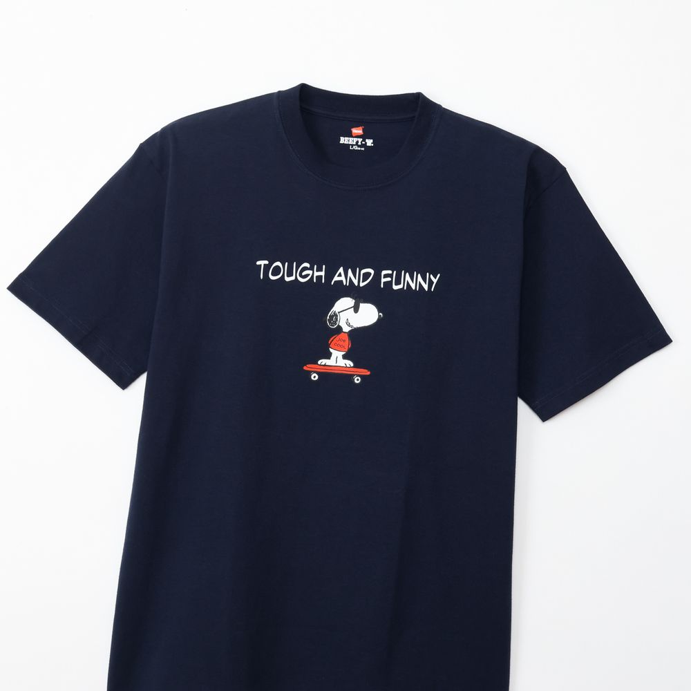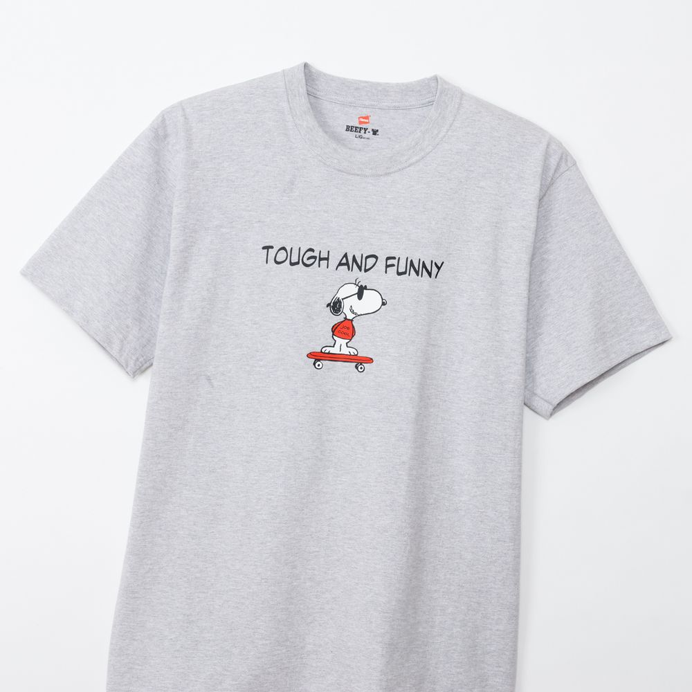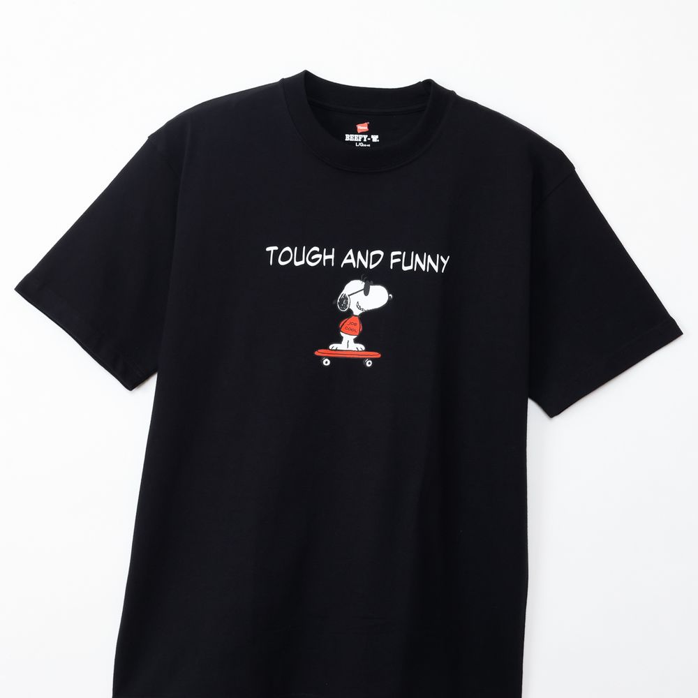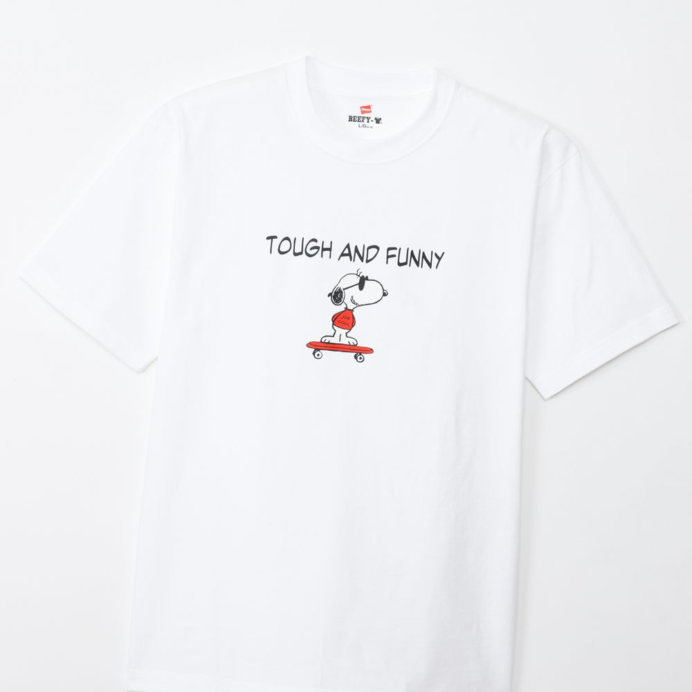 1975年に誕生したロングセラー、BEEFY-T(R)(ビーフィーT)初のアートプリント企画。プリンタブルボディとして誕生したBEEFY-T(R)に、コミックやキャラクターとして世界で愛され続ける「PEANUTS(ピーナッツ)」に登場する世界一有名な犬ともいえるキャラクター、スヌーピーを採用。BEEFY(R)のコンセプト「タフであること」が込められた「TOUGH AND FUNNY」の印象的なメッセージと、元気よくスケートボードを乗りこなすスヌーピーの変装姿のひとつ、クールな大学生に扮したJOE COOL(ジョー・クール)を胸元にデザイン。このアートはBEEFY-T(R)だけのオリジナルで、名前を入れたTシャツとスケートデッキの赤はHanes(R)(ヘインズ)のブランドカラー。ボディはBEEFY-T(R)で最も人気のHM1-D001クルーネックTシャツ。ヘビーウェイト(肉厚)のコットン100%生地を使用。洗えば洗うほど肌に馴染む風合いや、洗いこんでも首周りの伸びや型くずれが起きにくい強さと耐久性が特長です。アメリカンテイストを感じさせるクラシックなボックスシルエット。脇に縫い目のない丸胴編みに加え、首元にネームデザインをプリントするタグレス仕様で襟ネームの肌当たりを解消し、快適な着心地です。
