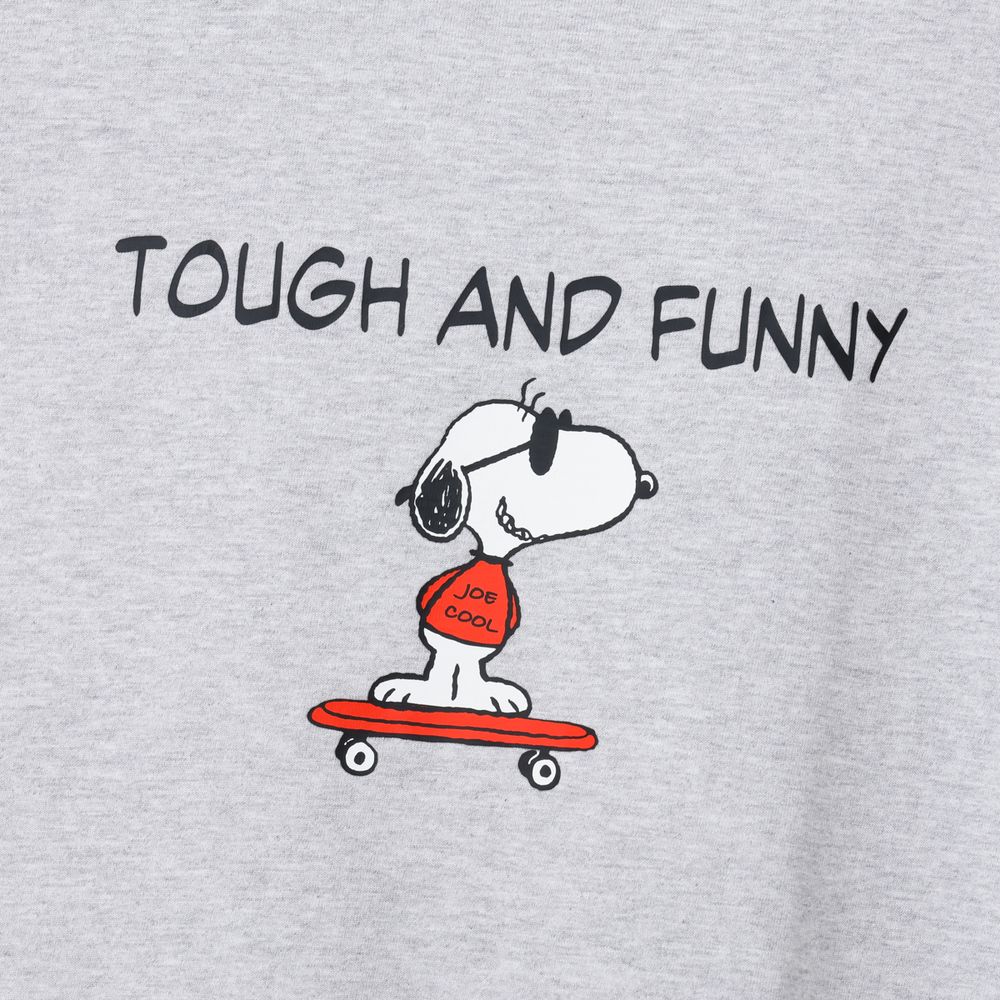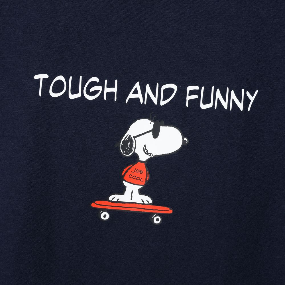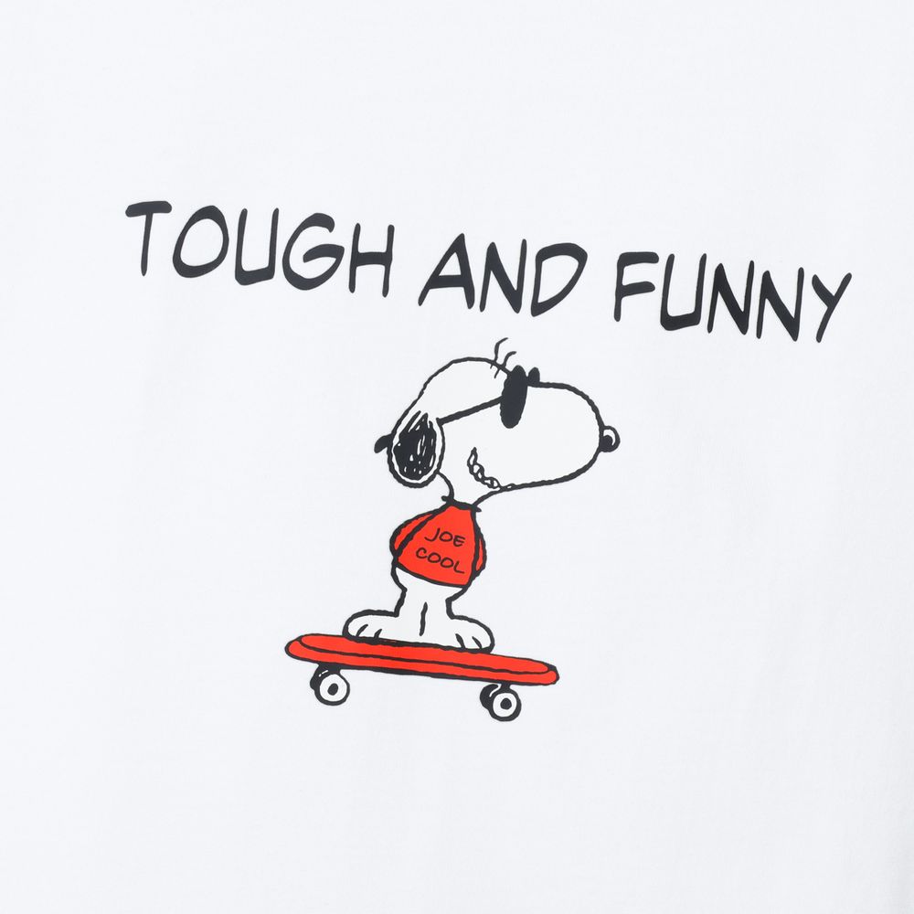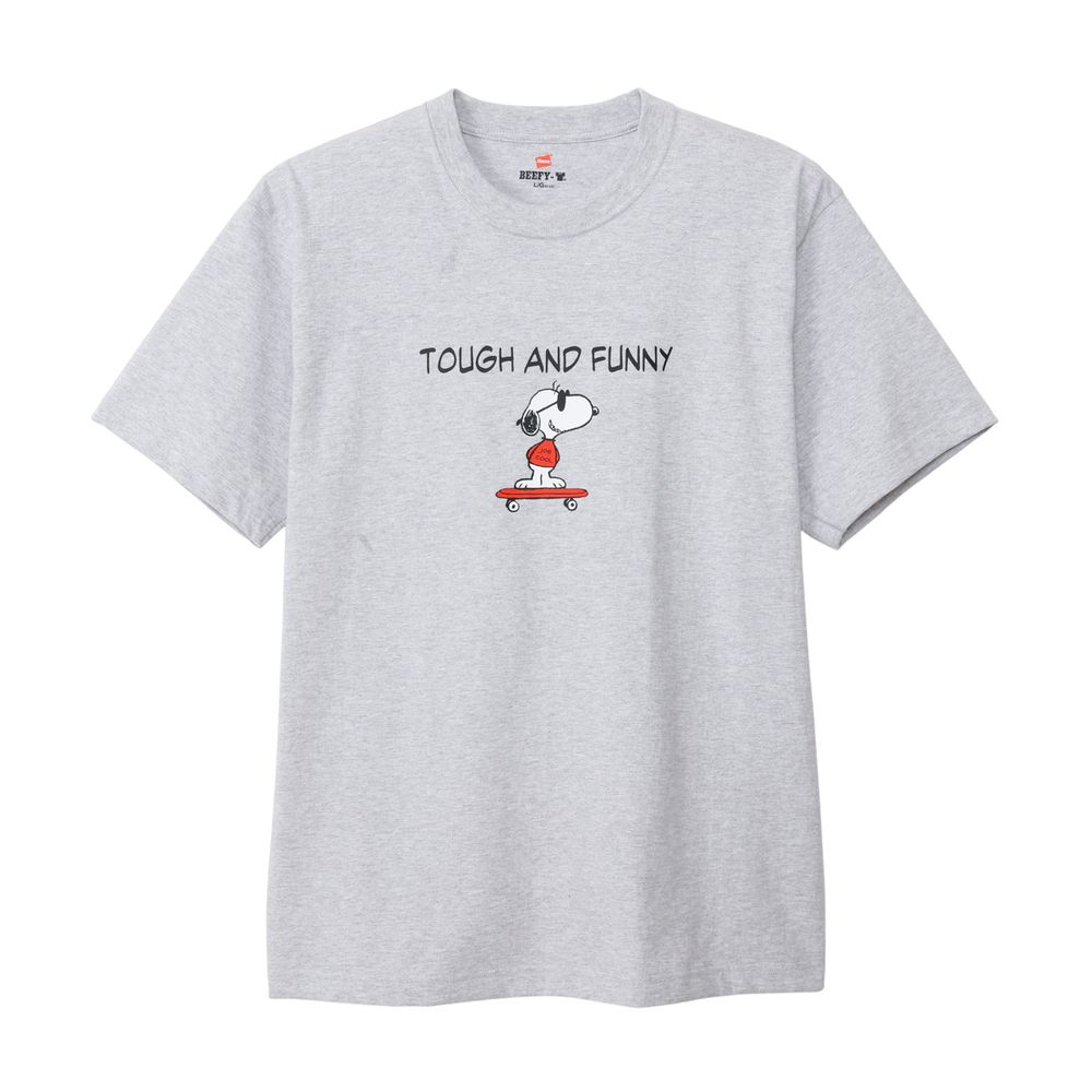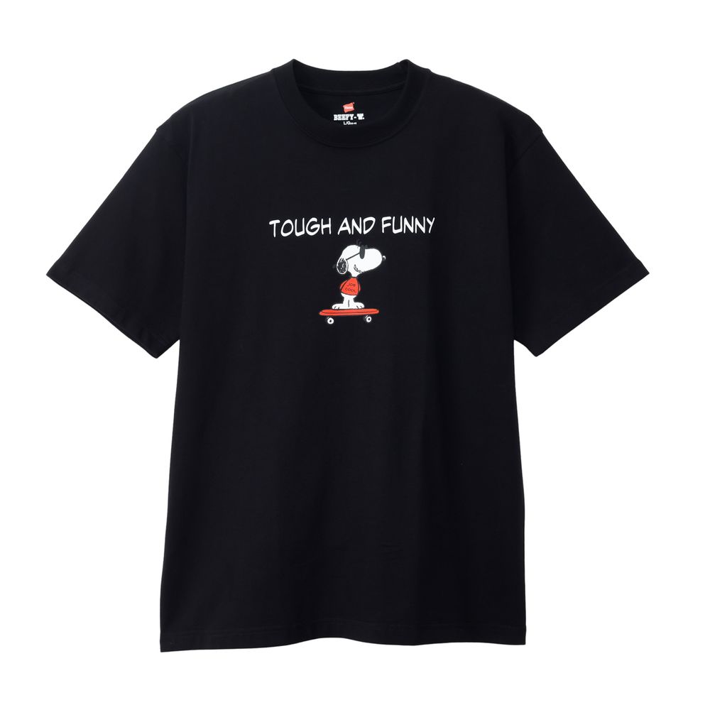 1975年に誕生したロングセラー、BEEFY-T(R)(ビーフィーT)初のアートプリント企画。プリンタブルボディとして誕生したBEEFY-T(R)に、コミックやキャラクターとして世界で愛され続ける「PEANUTS(ピーナッツ)」に登場する世界一有名な犬ともいえるキャラクター、スヌーピーを採用。BEEFY(R)のコンセプト「タフであること」が込められた「TOUGH AND FUNNY」の印象的なメッセージと、元気よくスケートボードを乗りこなすスヌーピーの変装姿のひとつ、クールな大学生に扮したJOE COOL(ジョー・クール)を胸元にデザイン。このアートはBEEFY-T(R)だけのオリジナルで、名前を入れたTシャツとスケートデッキの赤はHanes(R)(ヘインズ)のブランドカラー。ボディはBEEFY-T(R)で最も人気のHM1-D001クルーネックTシャツ。ヘビーウェイト(肉厚)のコットン100%生地を使用。洗えば洗うほど肌に馴染む風合いや、洗いこんでも首周りの伸びや型くずれが起きにくい強さと耐久性が特長です。アメリカンテイストを感じさせるクラシックなボックスシルエット。脇に縫い目のない丸胴編みに加え、首元にネームデザインをプリントするタグレス仕様で襟ネームの肌当たりを解消し、快適な着心地です。