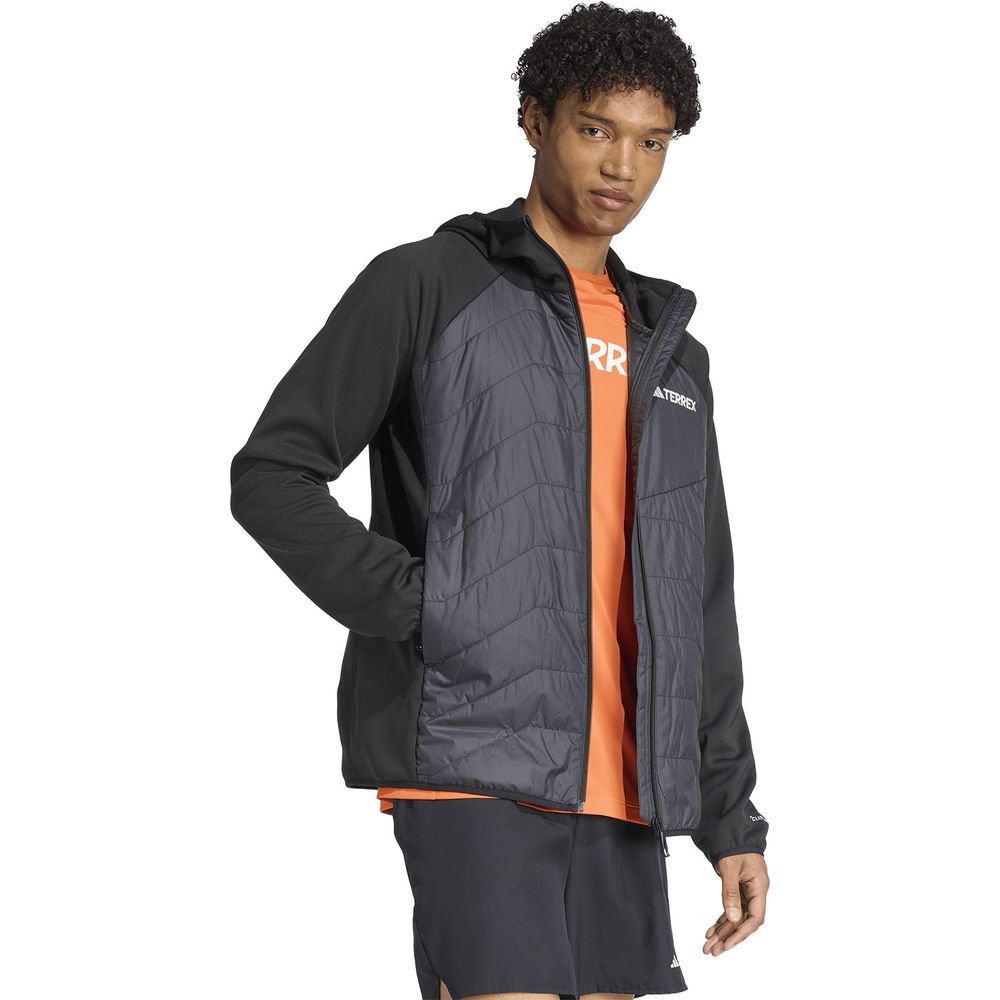 adidas Terrexの中わた入りハイキングジャケットが、気まぐれな山の天気への対応をサポートしてくれる。ニットとウーブン素材に、厚みを抑えた中わた素材を組み合わせたハイブリッド構造。ボディマッピング構造で、風を防ぎつつ、通気性が求められる部分にはしっかりと空気を通す設計。小雨も弾く。熱をウェアの内部に閉じ込めながら、汗を外部に放出して身体を冷やさないクライマウォームを採用。貴重品を携帯しやすいジップポケット付き。必要なときにしっかりカバーできるフードも装備している。保温性の高い素材が熱を逃さず、快適な体温を維持できる。悪天候をものともしない、保温性と撥水性による優れた保護機能を発揮するシェルレイヤー。