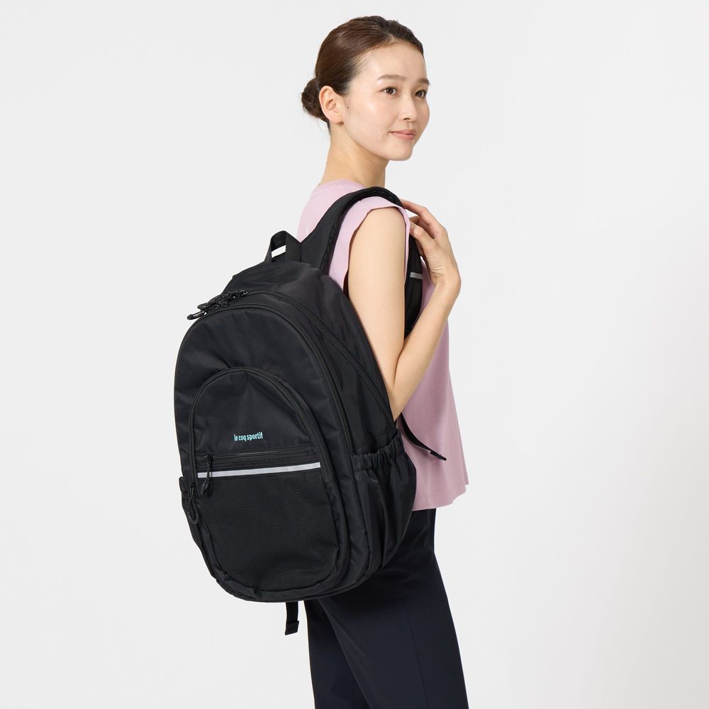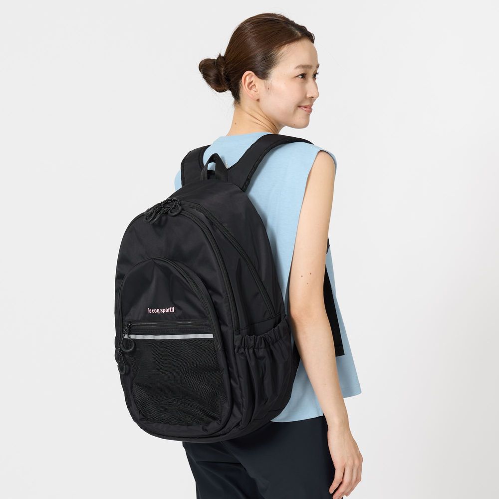 【自分仕様にアレンジ自由】キーホルダーを付けることができるDカンや、中身の見えるメッシュ素材のフロントポケットにお気に入りアイテムを収納し自分だけのバッグパックにアレンジ。容量はメインルームだけで約27Lと大容量。A4サイズを収納可能なPC・タブレットポケット付。サイドにはボトルや折畳傘が収まるメッシュポケット付。