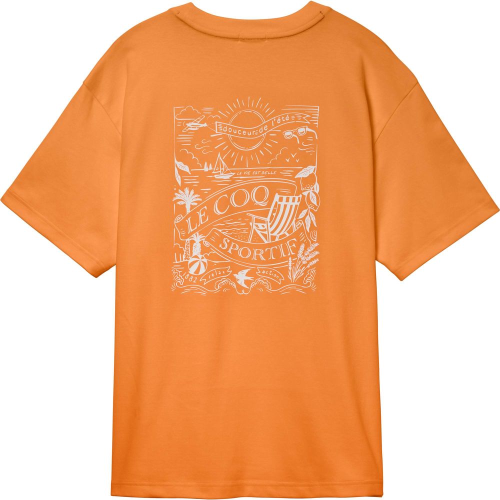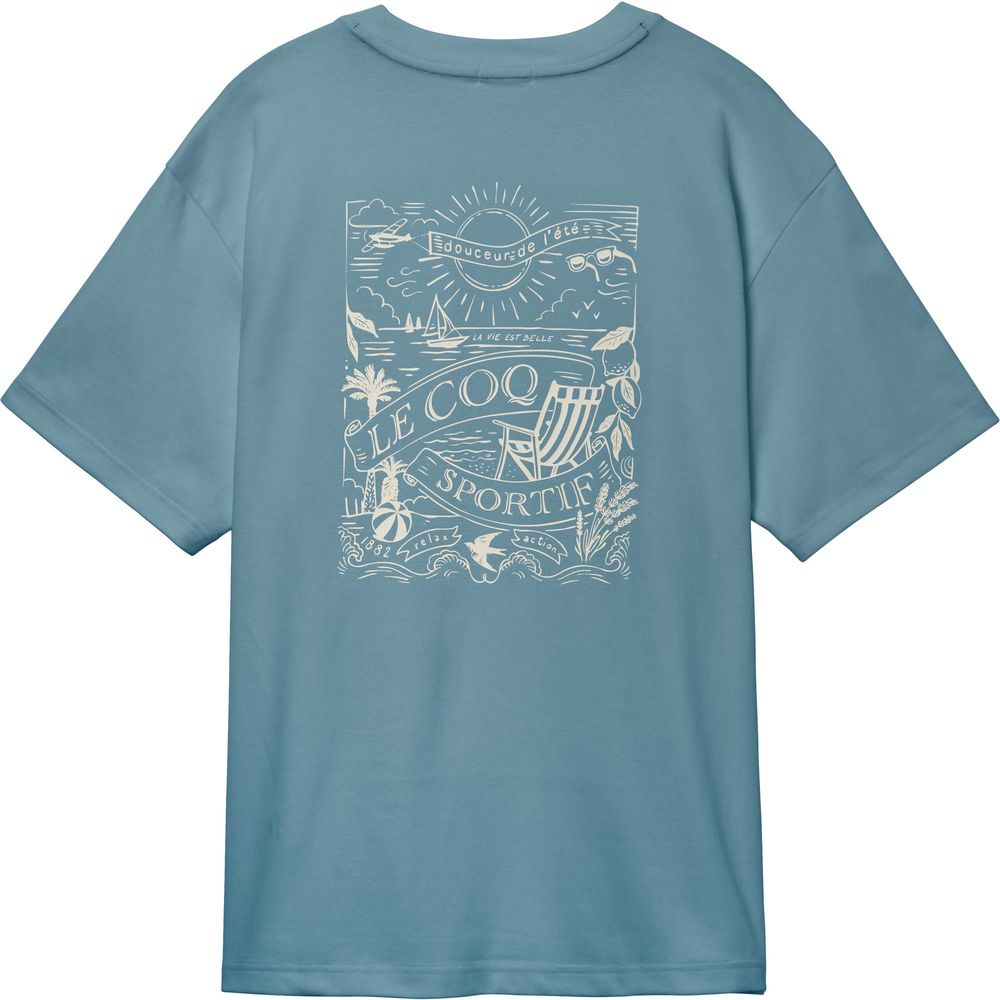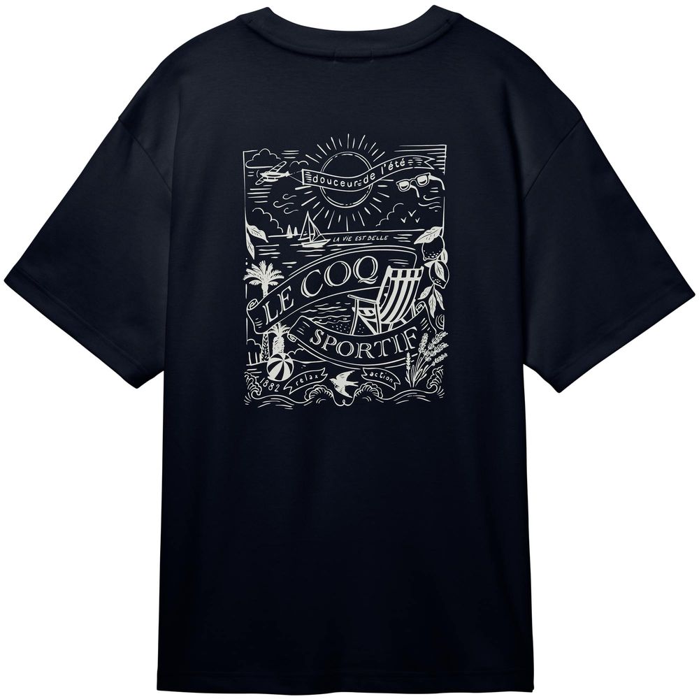 接触冷感素材が暑い季節にも心地よい半袖Tシャツ。背面の南仏の海辺をイメージした爽やかでリラックスしたムードのグラフィックデザインがポイント。