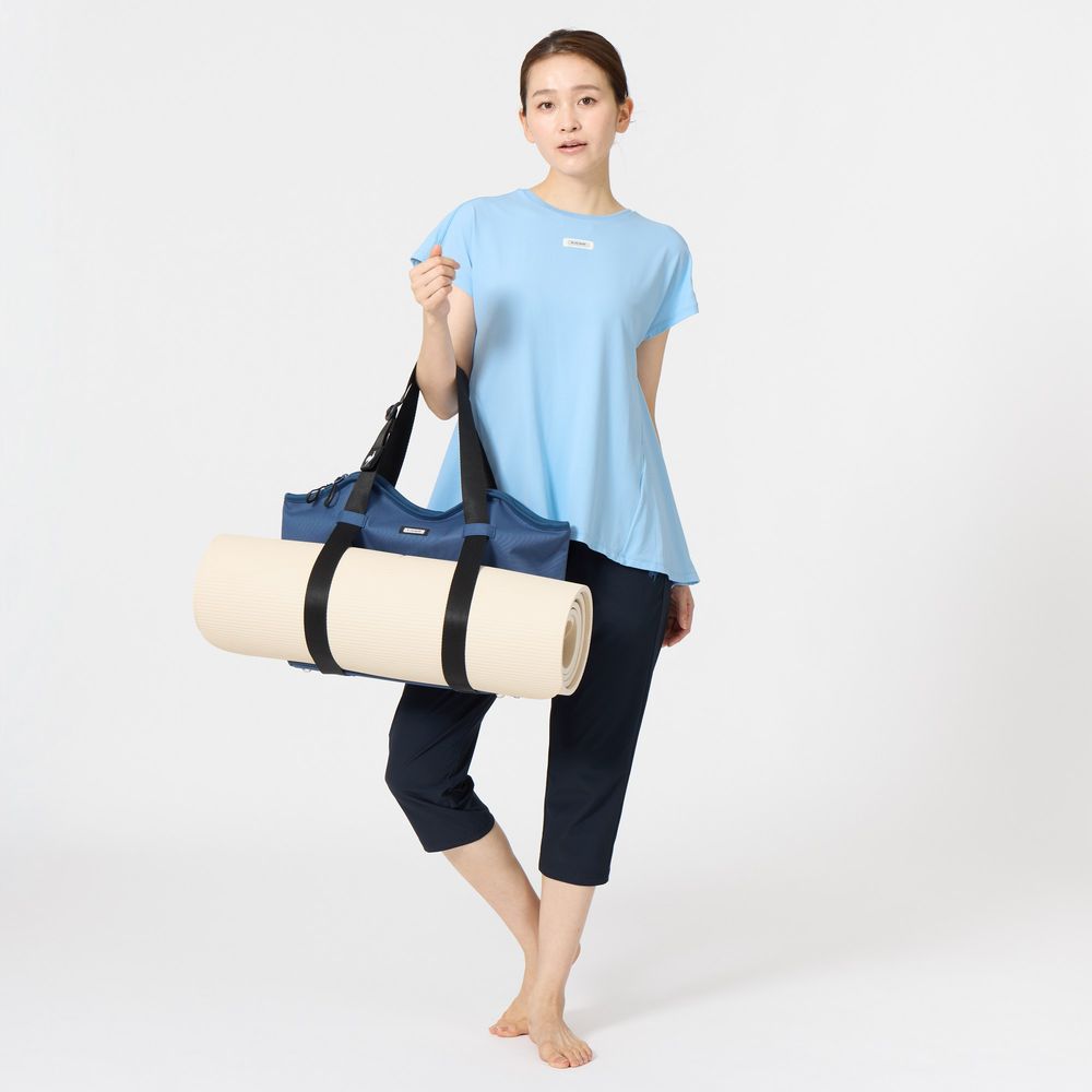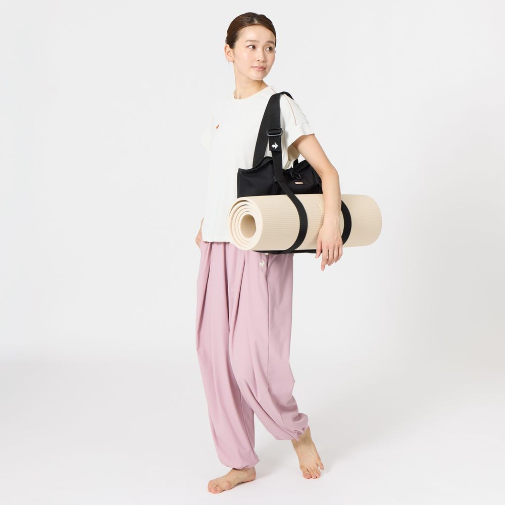 【A4サイズ収納可】容量は約16Lと便利なサイズ感。500mlのペットボトルが縦に入るサイズのボトルポケットが2つ付いており、内ポケットも大きめなので整理整頓に便利。ショルダーテープの間に脱いだアウターやヨガマットを挟むことで持ち運びが可能。