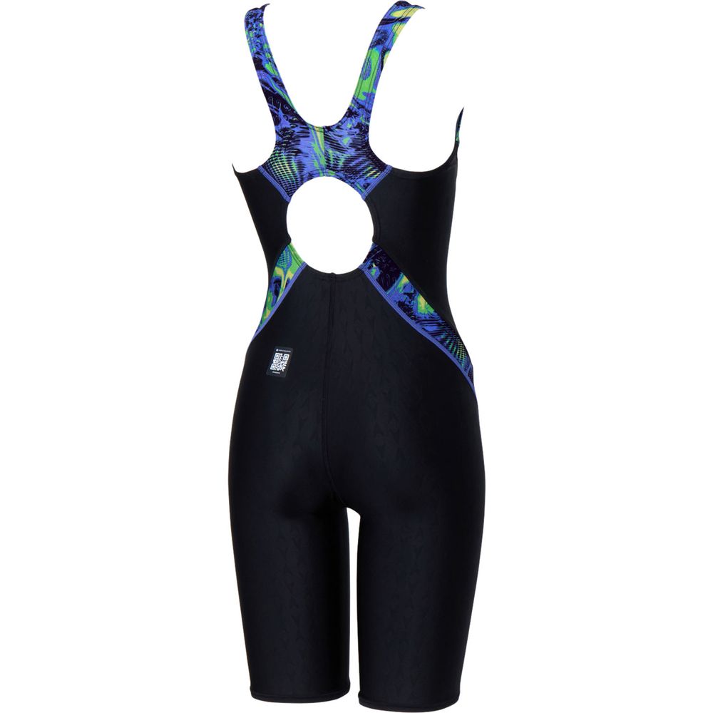 WORLD AQUATICS承認モデル。マスターズスイマーのための、透けにくく泳ぎやすい、安心感のあるレディースミニオープンバックニースキンです。リサイクルポリエステル糸を使用した環境配慮型素材「FLEX Σν(フレックス・シグマ・ニュー)」を採用。透けにくい安心感のある手持ち感と進化した伸縮性がスイマーのアクティブな泳ぎをサポート。表面のブーンエンボス加工が、ボディラインをカバーし、はっ水性が軽量感をキープします。立体設計・立体裁断によるフィット感が水の浸入を軽減し、快適な泳ぎを叶えます。セミオープンタイプよりも小さな背穴で露出を軽減。幅広の肩ストラップが食い込みを抑えます。着脱しやすく、着用時の締め付け感を抑えた腰回りのサイズ感。裾部分のステッチを表出しにすることで、肌あたりを抑えています。別売りのカップを使用できるフック受けが付いています(※カップは付属しておりません。SpeedoのハンギングスイムカップSE32001がオススメ)。膝上までのレッグ丈(4分丈)。 「Morphosis(モルフォシス)」をテーマとした鮮やかなグラフィックを部分使いしています。無地の水着に飽きた方や柄もの初挑戦の方でも取り入れやすいプリント使いです。縦ラインにプリントをあしらうことでのスタイルアップ効果も期待できます。快適性にこだわった一枚は、レーシング水着初心者にとくにオススメです。