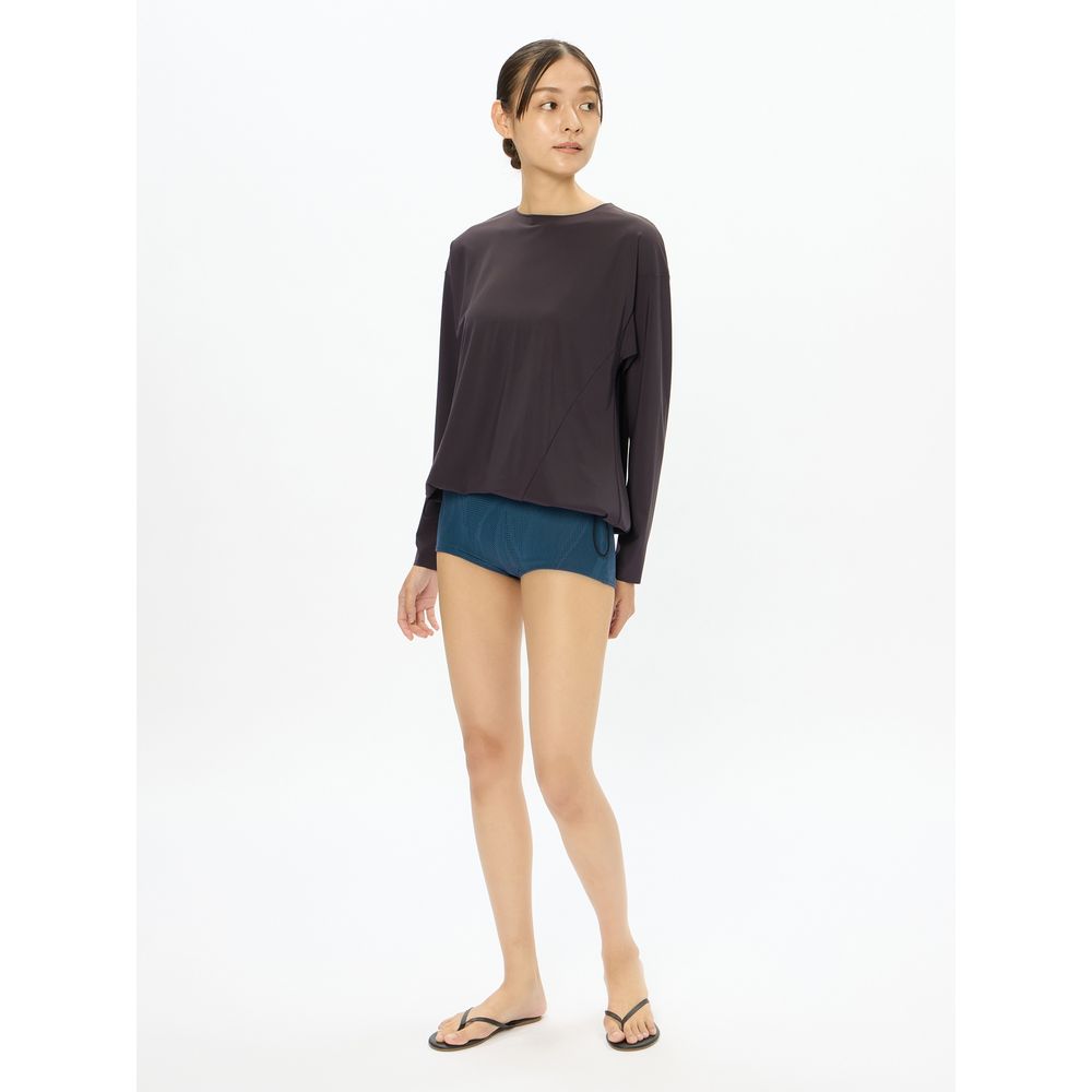 非日常でととのえるのこころの健康をテーマに大人のスイムウエアを提案する「Speedo breath(スピード・ブレス)」。GRS認証のすてられるべき廃棄物を100%使用したナイロン糸「RECO(R)NYLON(レコ・ナイロン)」を使用したリサイクル素材「Sensitive(R)Reco(センシティブ レコ)」採用のレディースロングスリーブトップスです。裾にドローコードを施し、好みや気分に合わせてシルエットを調節できます。トレンド感のあるややゆったりとした身幅。後ろの引手ファスナーは接着仕様でスッキリとしたデザイン。ラッシュガードとして水着の上に着用する他、アスレジャーやタウンでも重宝する一枚です。UVカット機能付き。
