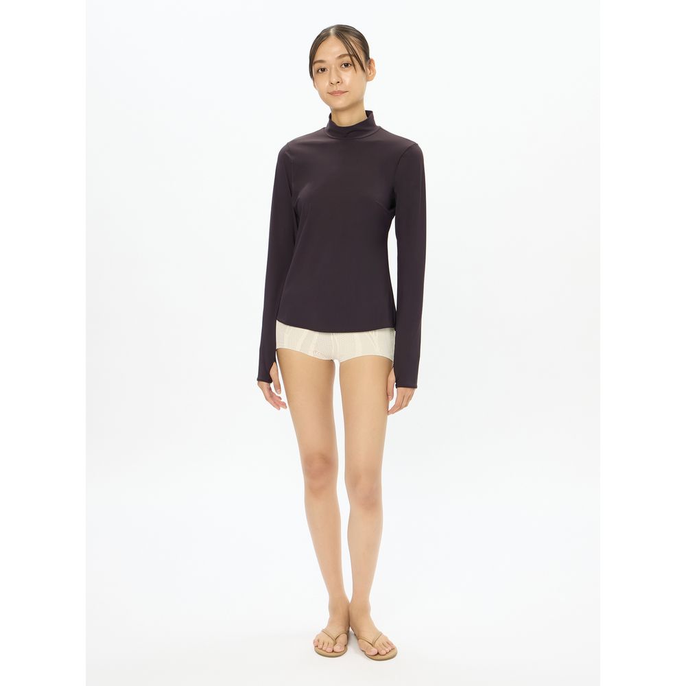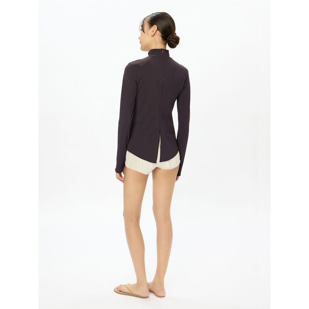 非日常でととのえるこころの健康をテーマに、大人のスイムウエアを提案する「Speedo breath(スピード・ブレス)」。女性らしいボディラインを引き立てるレディースラッシュガードです。GRS認証の捨てられるべき廃棄物を100%使用したナイロン糸「RECO NYLON(レコ・ナイロン)」を使用した環境配慮型素材「Sensitive Reco(センシティブ レコ)」を採用。サラッとした質感で、快適なストレッチ性が特長です。UVケア(UPF15-30、紫外線カット率85%以上)機能付き。首元のUVケアもできるハイネックデザインで、バスト下から裾にかけての絶妙なラインが美しいボディラインを演出します。バックスリットがこなれた印象。シンプルながらもこだわりが詰まった一着です。ラッシュガードやカバーアップとしてのプールでの着用はもちろん、UVケアトップスとしてタウンユースにもおすすめです。