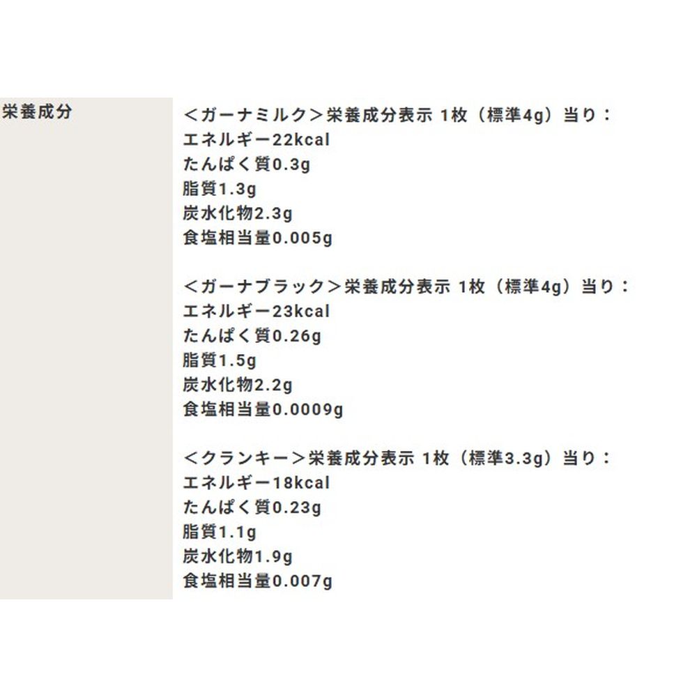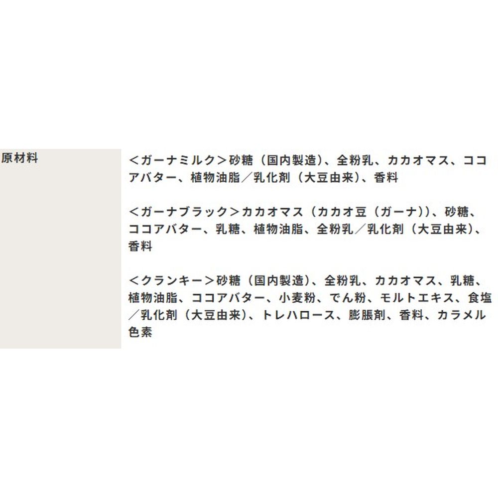内容量:105g (ガーナミルク40g、ガーナブラック32g、クランキー33g(個包装込み))
