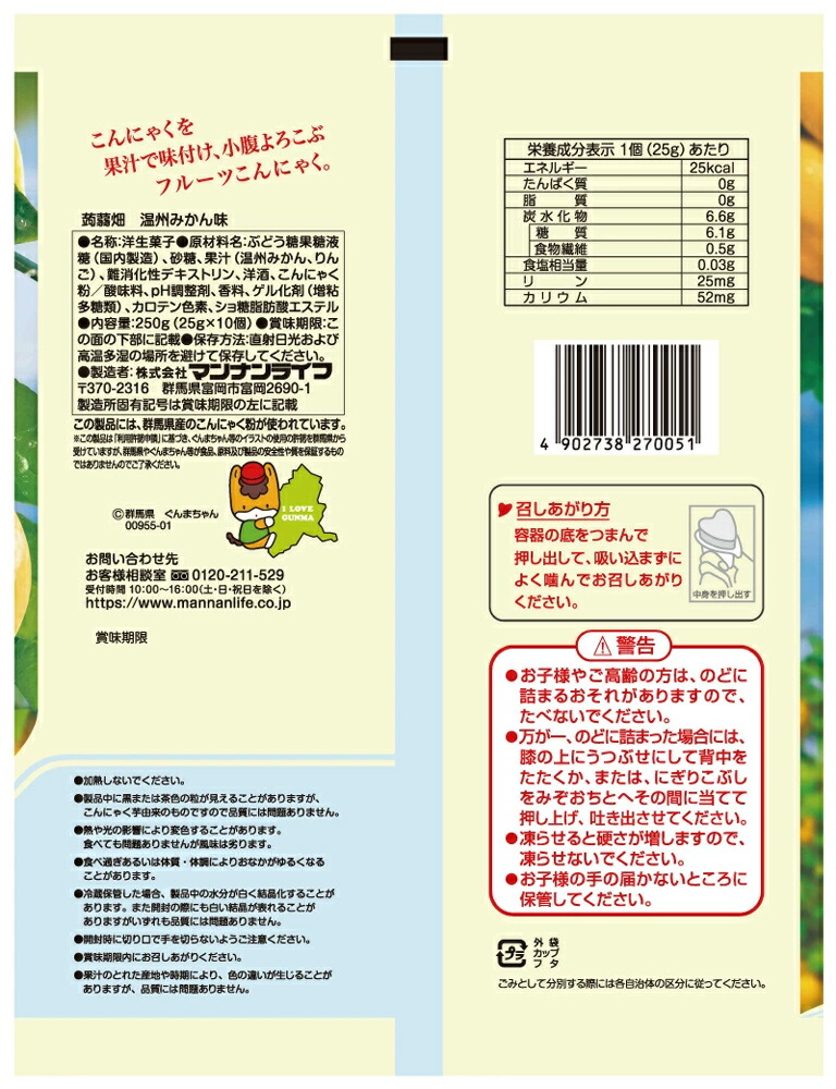 材料名:ぶどう糖果糖液糖(国内製造)、砂糖、果汁(温州みかん、りんご)、難消化性デキストリン、洋酒、こんにゃく粉/酸味料、pH調整剤、香料、ゲル化剤(増粘多糖類)、カロテン色素、ショ糖脂肪酸エステル