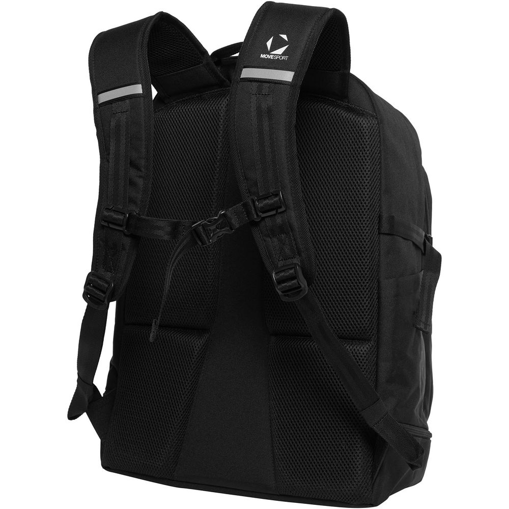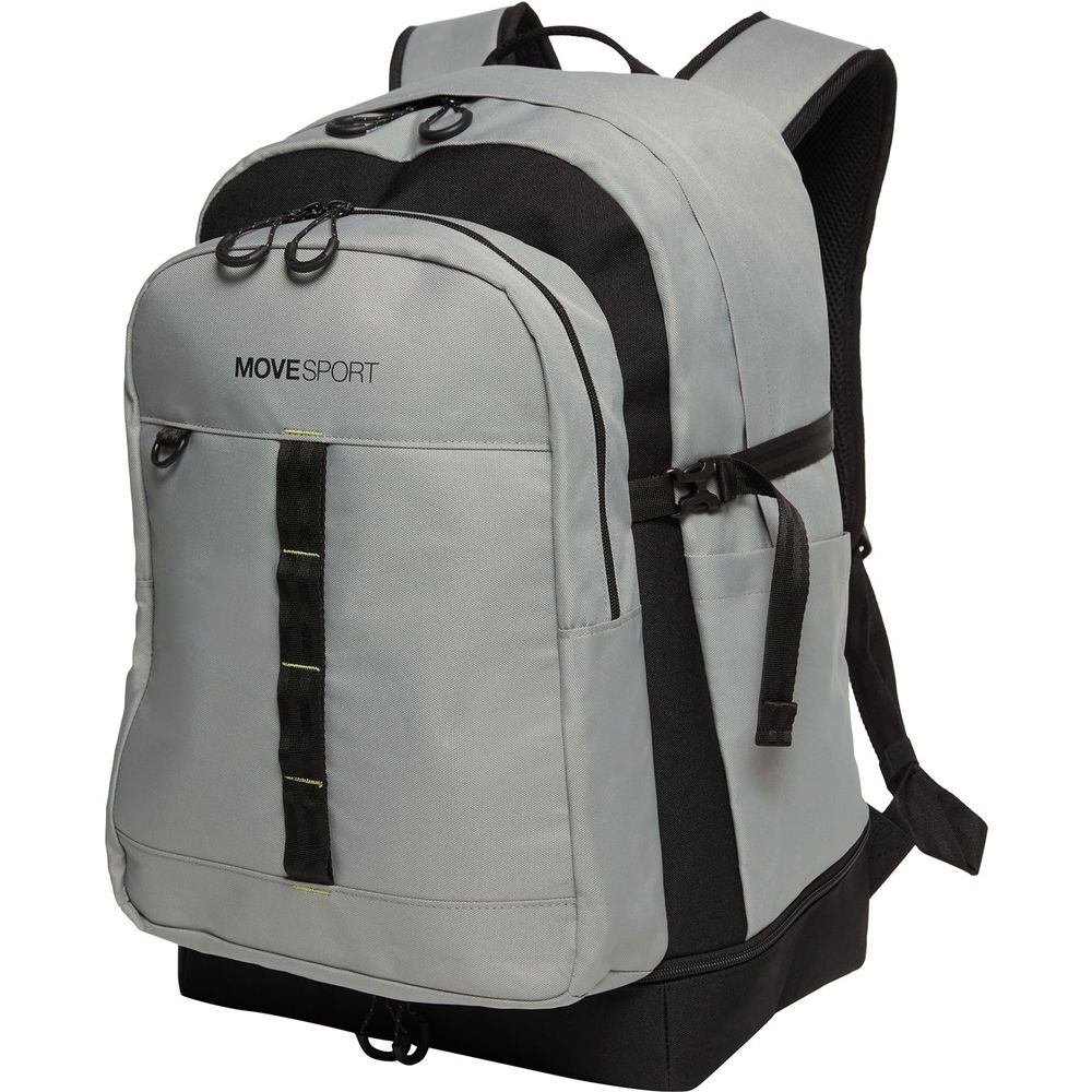 本体生地にはっ水加工を施した600Dのポリエステル素材を採用した総容量40Lのバックパックです。あまり荷物を入れない時は、両サイドのベルトで容量の調節が可能で、大容量でありながら、移動時に邪魔にならないようにコンパクトに見えるデザインにこだわりました。背面は厚めのクッションがあり、背中の汗をかきやすい部分を凹ませたデザインにすることで通気を促し、快適な背負い心地になる設計にしています。シューズ収納スペースは使用しないときはメインルームを大きく使える2WAYデザインに。メインルームにはPCスリーブや小分けのポケットを、キーフック付きの前ポケットや両サイドのポケットなど、充実の収納力です。前部にストラップホールが付いているので、自分好みのアイテムを取り付けることが可能です。オリジナルロゴ入りの裏地には抗菌防臭加工を施しています。肩にフィットする形状のショルダーハーネス構造で、チェストベルトを装着すればより安定したフィット感で着用できます。ショルダーハーネス部の両サイドに、リフレクターベルトを搭載しています。