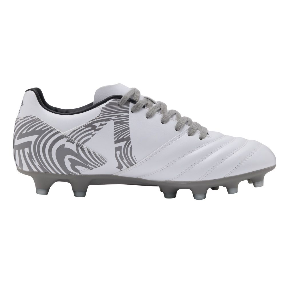 『ACCERATOR』シリーズの合成皮革アッパーシューズ。フットボールの激しい動きの中でパフォーマンスを発揮することをコンセプトにラスト開発を実施。アンブロが持つフィッテイングサポートファンクションのAフレームをグラッフィクデザインで表現。プレー時の安定感向上を目指し、指が動かしやすい前足の適度な幅と、かかと回りの立体形状にこだわり設計。ラスト設計を活かせるような中足部のパターン構造やシューホールデザインを採用。かかと周辺は自然な収まりを目指して材料選択を実施。アウトソールはパフォーマンスアップを目指し、刺さりと抜け易さを目指した設計を採用。