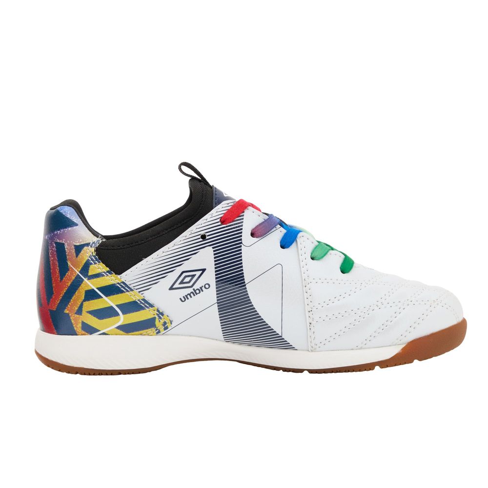 『ACCERATOR』シリーズのスターター/ステップアッププレーヤー向けシューズ。日本国内企画のワイドラスト。アンブロが持つフィッティングサポートファンクションのAフレームをグラフィックデザインで表現。インステップキック時のインパクトを意識しやすいプリント加工を採用。ノンマーキング仕様のインドアコート専用アウトソールを採用。Aフレームパーツを採用。アッパー材全体に耐久性のある合成皮革を採用。クッション性と反発性を考慮したインジェクションEVAをミッドソールに採用。取り外し可能なEVAカップインソール。
