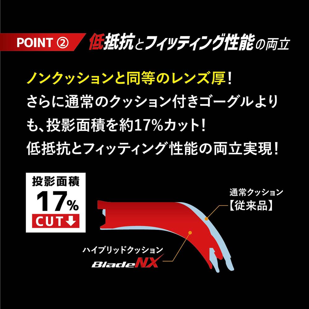 くもり止め機能10倍のスワイプアンチフォグ搭載。独自のハイブリッドクッションを搭載したblade新シリーズBLADE NX。薄型クッションで快適なフィッティングとノンクッションに近い低抵抗を実現。トップレーシングゴーグルミラータイプ。