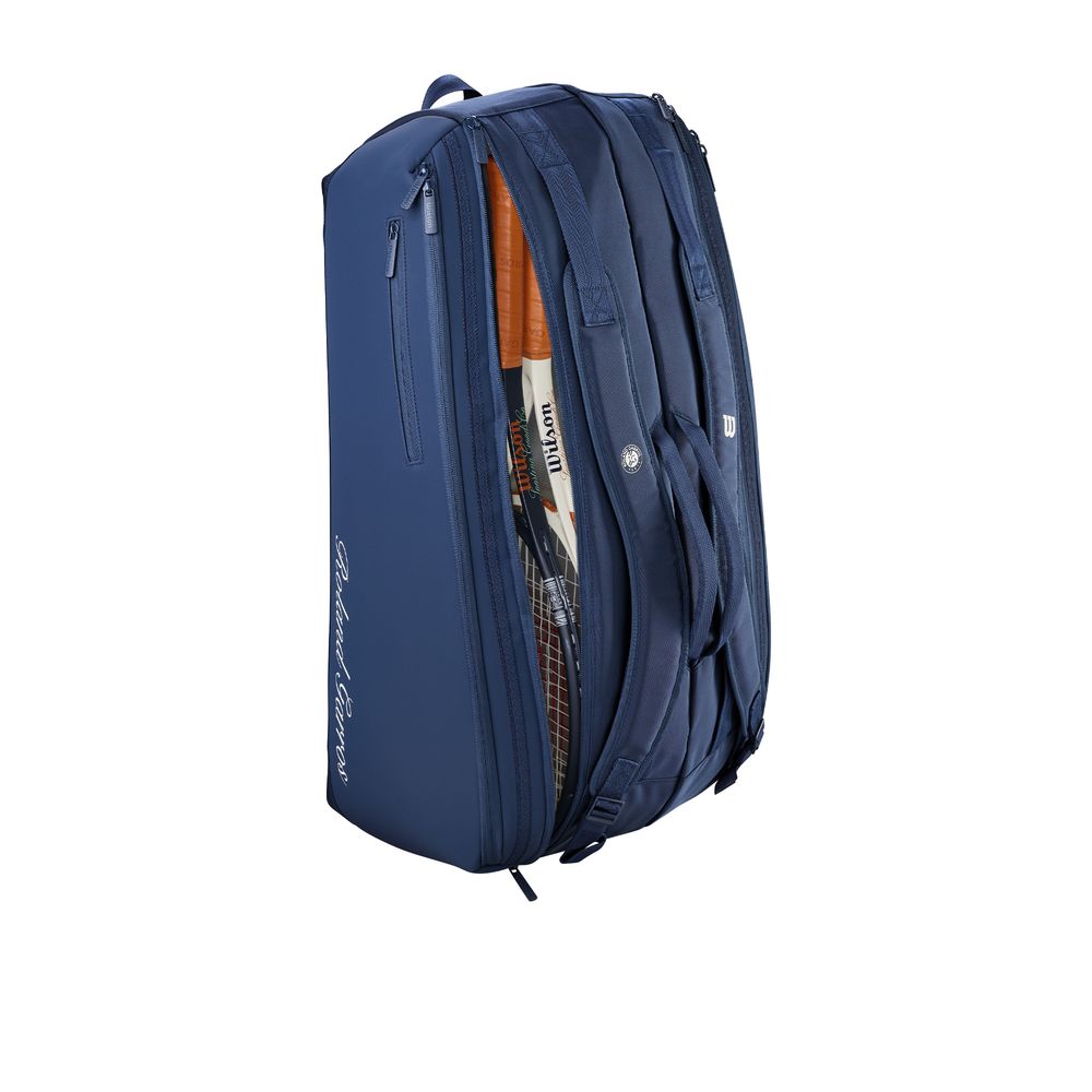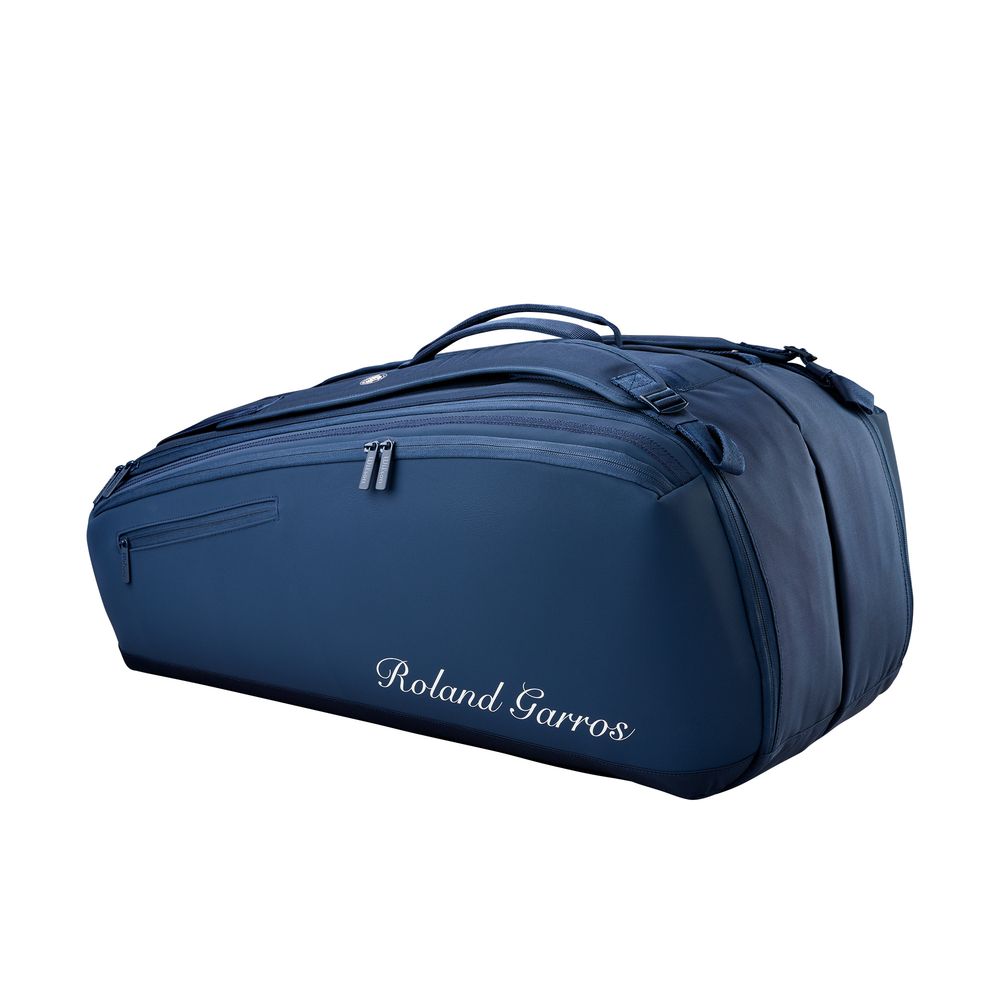 2026年全仏オープンROLAND GARROS(ローラン・ギャロス)デザインのツアーバッグ。SESSION DE SOIREE(セッション・ド・ソワレ)にインスパイヤされたネイビーを基調としたカラーリング。メインポケットは2室に分かれており、ラケットは最大9本まで収納可。1室はサーモガード(内部の温度上昇を防ぐテクノロジー)を搭載。両サイドには小物が収納出来る大型のアウトポケットが備えられています。パッド付のショルダーストラップはバッグパック仕様、肩掛け仕様の両方の用途で使用可能です。素材は軽量かつ高強度・高耐久性の900Dポリエステルを使用しています。
