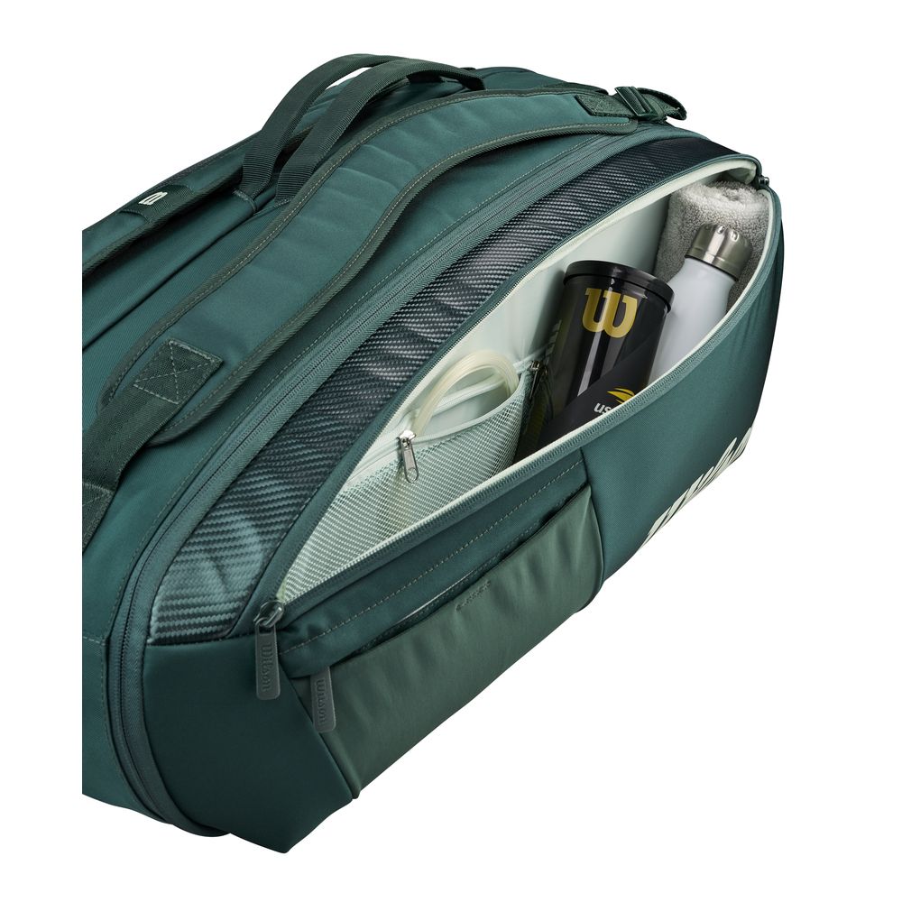 BLADE V10のキーカラーグリーンをモチーフにしたデザイン。メインポケットは2室に分かれており、ラケットは最大9本、その他にアパレルやシューズ等も収納可能。メインの1室は荷物を温度から保護するブラック・サーモガード裏地を採用。両サイドの大型ポケットにはサングラスや、携帯電話、鍵等の小物も収納が可能。軽量かつ高強度・高耐久性の素材を使用。肩掛けする際にも負担にならないようにパッド付き。